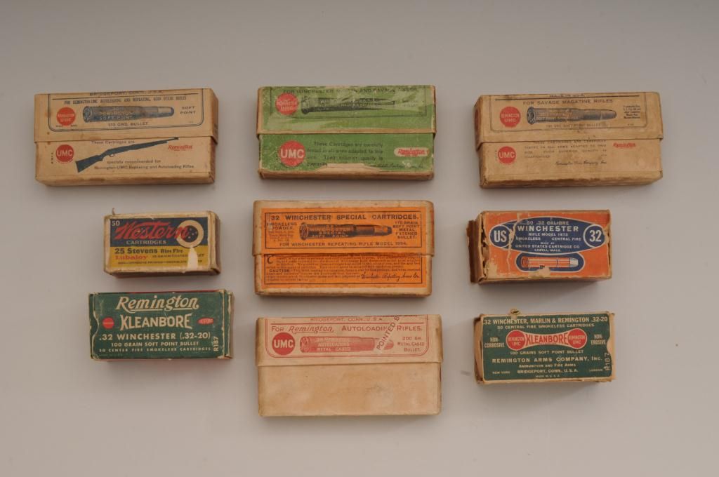 Lot of 16 boxes of collector ammo, some full, some partials including makers Winchester, Remington, Remington-UMC, Western, Peters and U.S. Cartridge Co. in a variety of calibers including .38-55, .25-35, .30-30, .32 WS,.32-20, .30 Army full patch, .32-40, Stevens RF and .30-40 Krag; various conditions of boxes and cartridges. Est.: $300-$600.