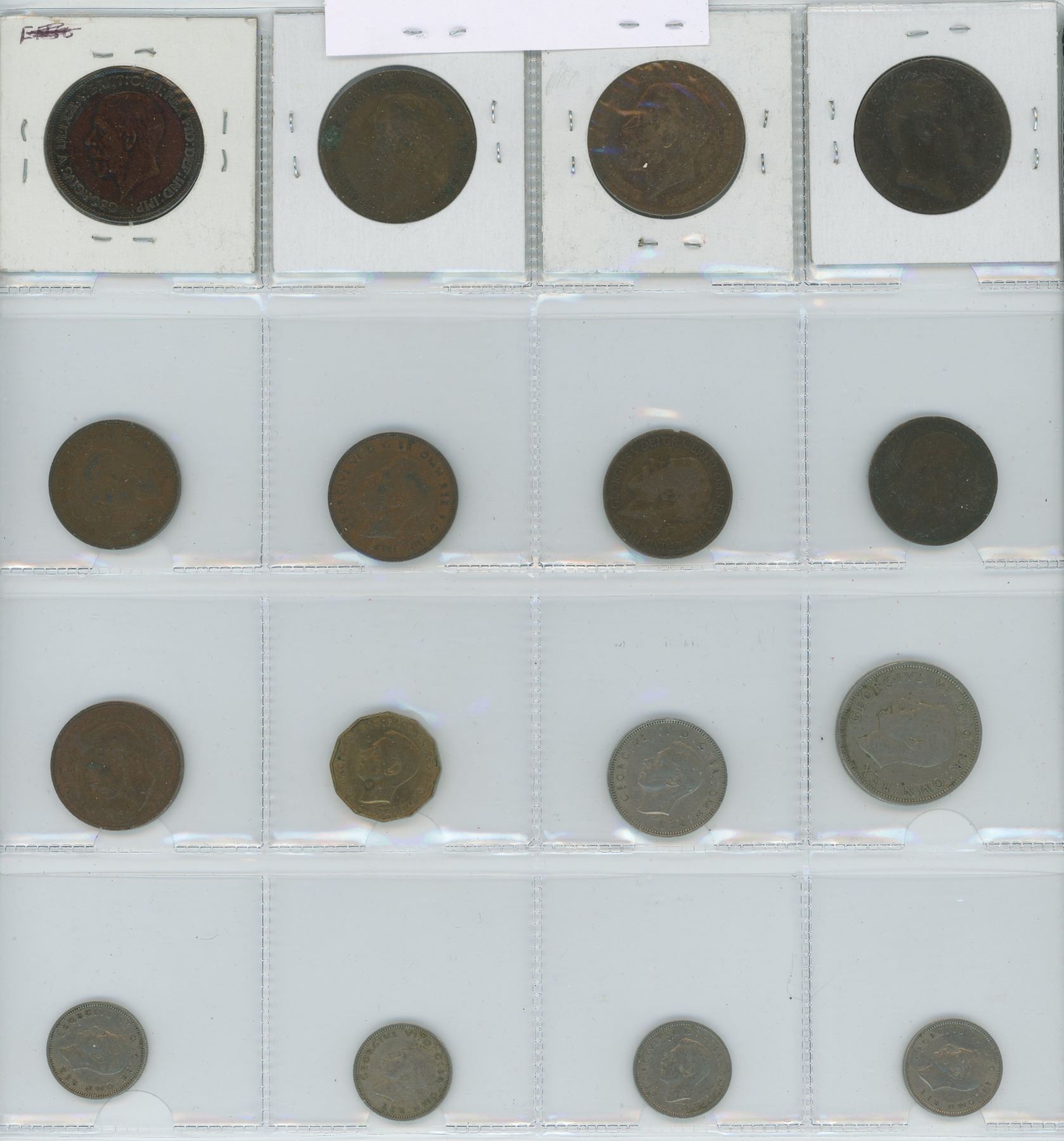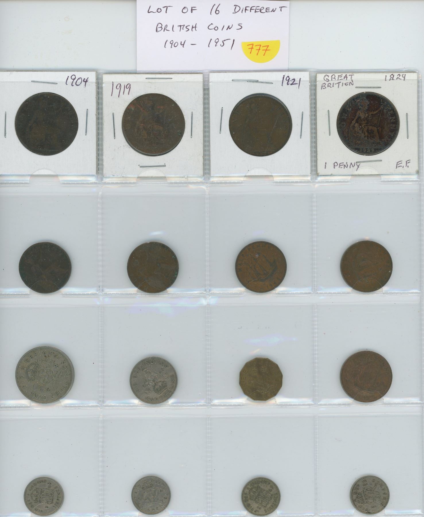 Lot of 16 different British coins 1904 – 1951 including pennies, half pennies, 2 shilling, shilling,