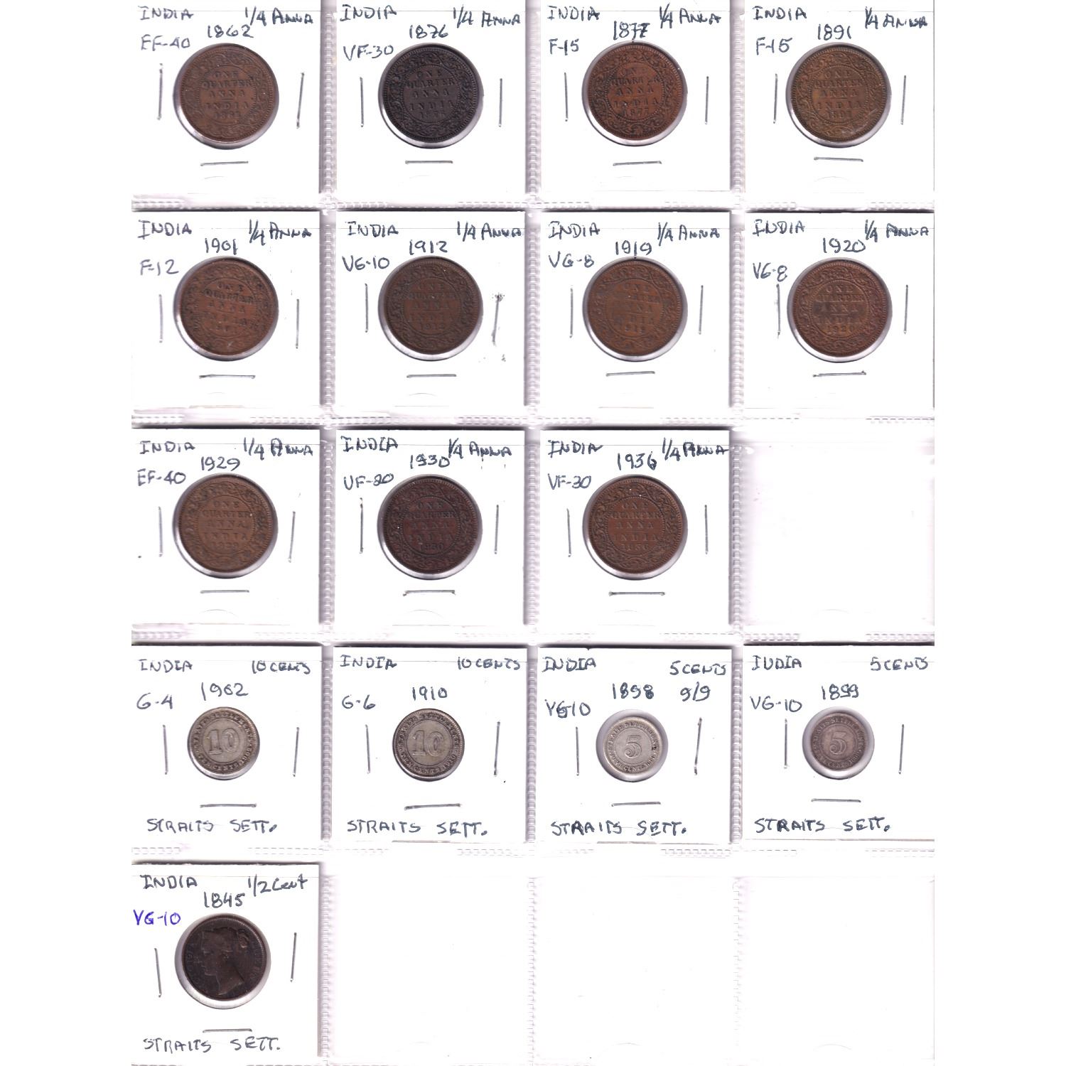 Lot of 16x 1845-1936 India 1/4 Anna, 5-cents, 10-cent & 1845 1/2 Cent coins. Coin ranges in grade from Good to EF. Please view image for details. 16pcs