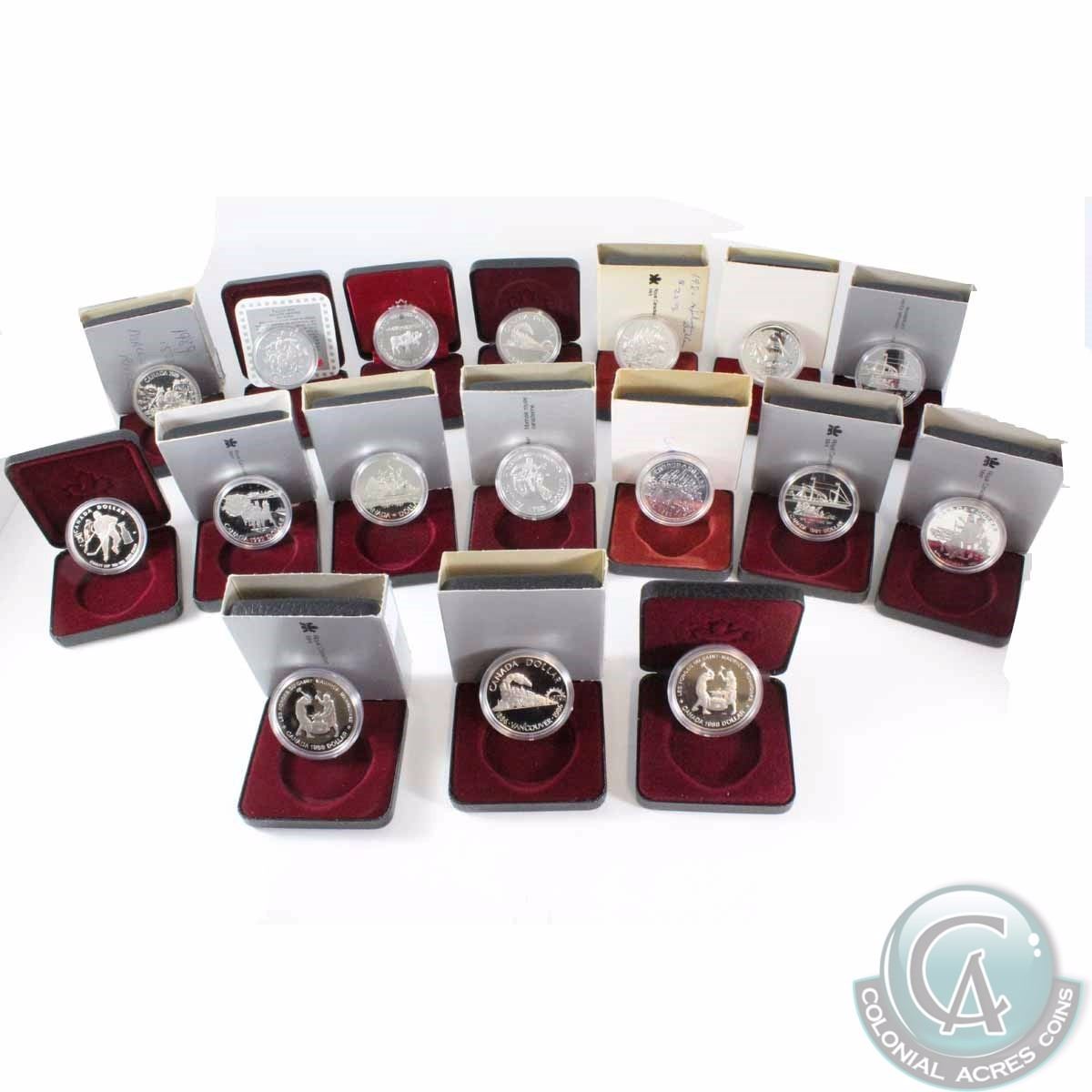 Lot of 17 Canadian Proof Silver Dollars (a few cases do not have the grey cardboard sleeve): 1994, 1993, 1992, 2x 1991, 1990, 1989, 2x 1988, 1987, 2x 1986, 1985, 1983, 2x 1980, 1979. There is 7.5 ounces of pure silver in this lot.17pcs