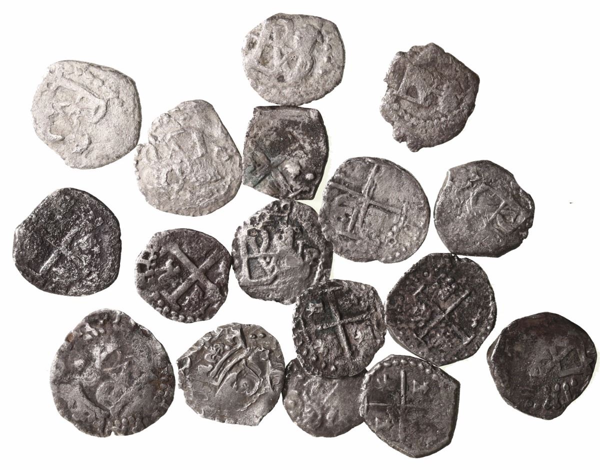 Lot of 17 Potosi, Bolivia, cob 1/2R, Philip III and IV, assayers B and T (where visible). 21.36 grams total. Most salvaged but nearly all with full crosses and/or monograms, mostly toned, all somewhat scarce.