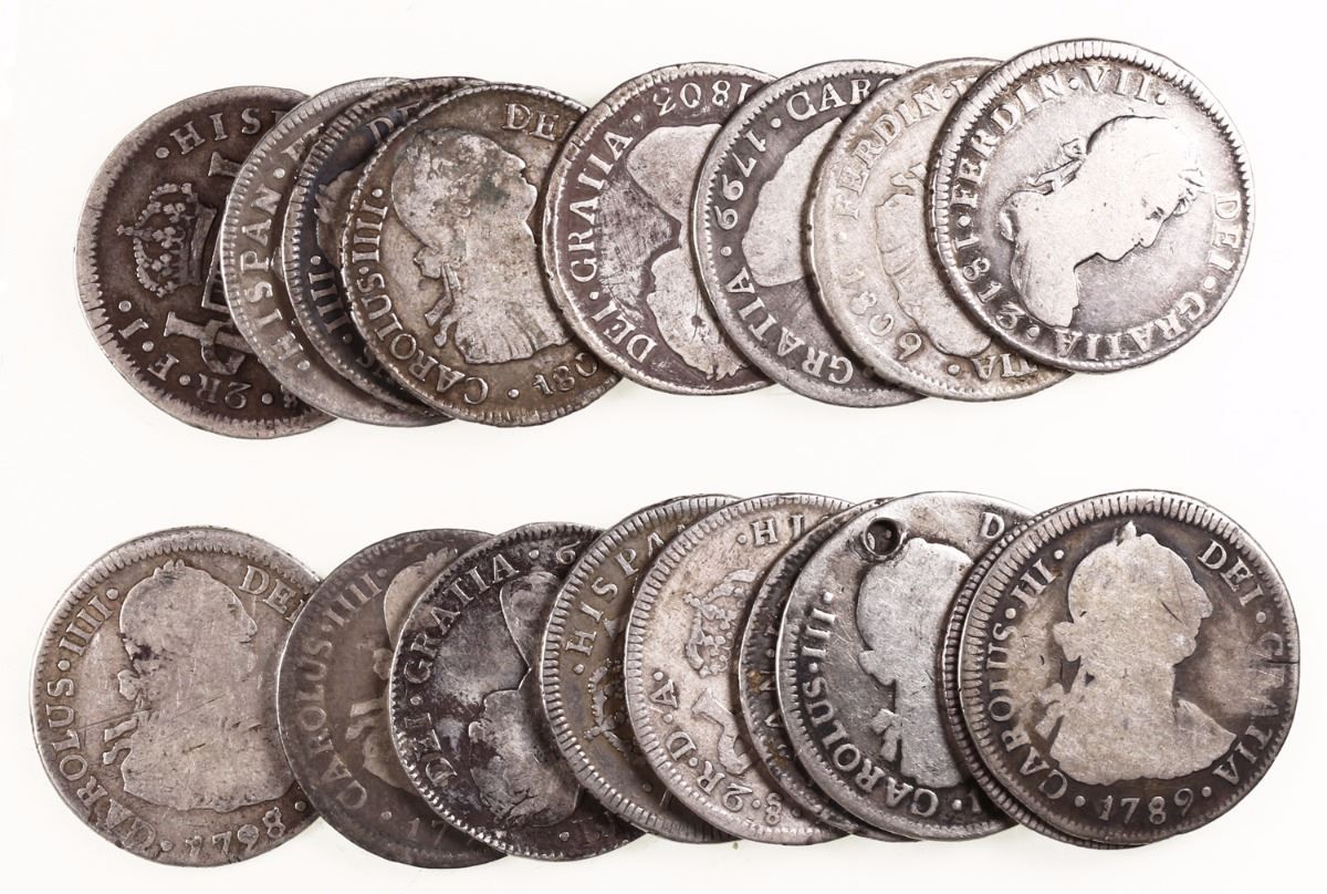 Lot of 17 Santiago, Chile, bust 2 reales, Charles III through Ferdinand VII, dates as follows: 1786DA, 1788DA (2), 1789DA, 1793DA, 1797DA, 1798/7DA, 1799DA (2), 1803FJ, 1804FJ, 1806/5FJ, 1809FJ, 1810FJ, 1811FJ, 1813FJ and 1817FJ. 106.43 grams total. VG-F on average, mostly nicely toned, one of the 1788's holed, all with clear dates (the overdates scarce).