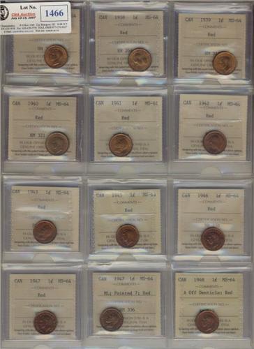 Lot of 17 different "George VI" small cents. All ICCS grades MS64 Red. Includes 1937,1938,1939,1940,1941,1942,1943,1945,1946, 1947,1947 ML Pointed,1948 "A" off,1948 "A" to dent.1949 "A"off, 1950,1951,1952. A nice nearly complete set.