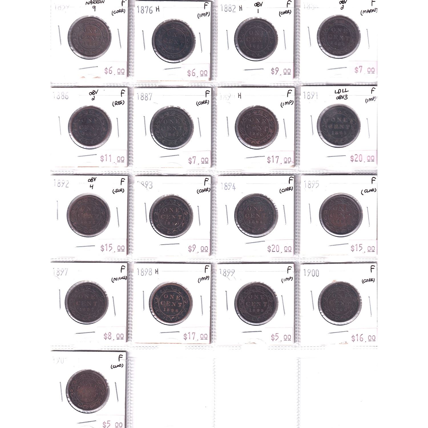 Lot of 17x 1856-1901 Canada Large Cent Coins Fine (imp). Lot Includes: 1859 Narrow 9, 1891 LDLL Obv 3, 1898H, & More! Please view images for details and quality. 17pcs.