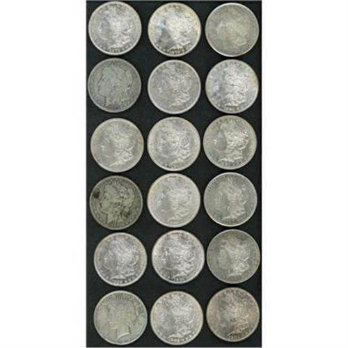 Includes: 1878-CC Morgan Dollar, 1879 Morgan Dollar, 1879-O Morgan Dollar, 1880 Morgan Dollar, 1880-O Morgan Dollar, 1882-CC Morgan Dollar, 1883-S Morgan Dollar, 1885-S Morgan Dollar, 1887-O Morgan Dollar, 1887-S Morgan Dollar, 1889 Morgan Dollar, 1890-CC Morgan Dollar (x2), 1891 Morgan Dollar, 1892 Morgan Dollar, 1901-O Morgan Dollar, 1903 Morgan Dollar, 1923 Peace Dollar. Lot of 18 coins.