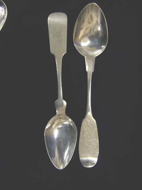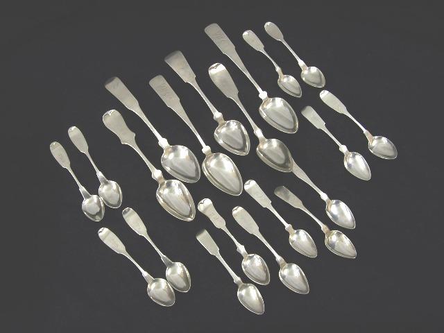 Lot of 18 Coin silver spoons including 12 small dinner spoons and 6 large serving spoons. All spoons are hall marked, monogrammed and slightly different patterns. Condition normal use and wear. Approx