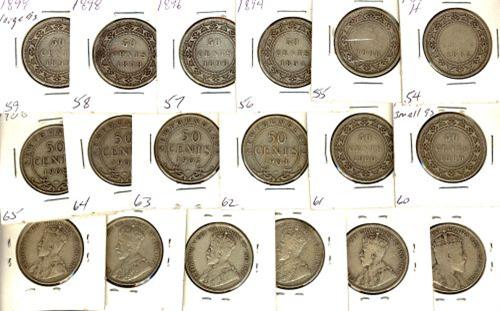 Lot of 18 Newfoundland 50 cent pieces. Includes 1882H, 1888, 1894, 1896, 1898, 1899 "Large 9's", 1899 "Small 9's", 1900, 1904H, 1907 (2), 1908, 1909, 1911, 1917c, 1918c (2), 1919c. Grades vary from G-4 to VF-20.