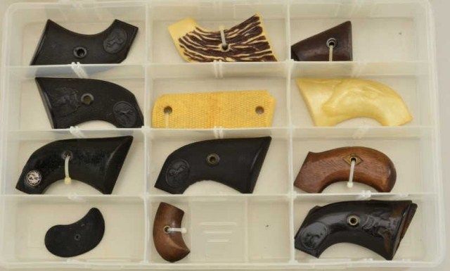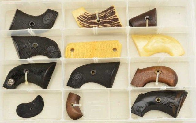 Lot of 18 pairs of pistol and revolver grips and several single pieces including a group of 10 nicely made modern wood grips for the Model 1860 Army and pocket model Colts, a pair of S&W grips for the victory modelrevolver plus a pair of Ruger medallion wood grips, several faux ivory and faux stag grips, etc. Est.: $100-$200.