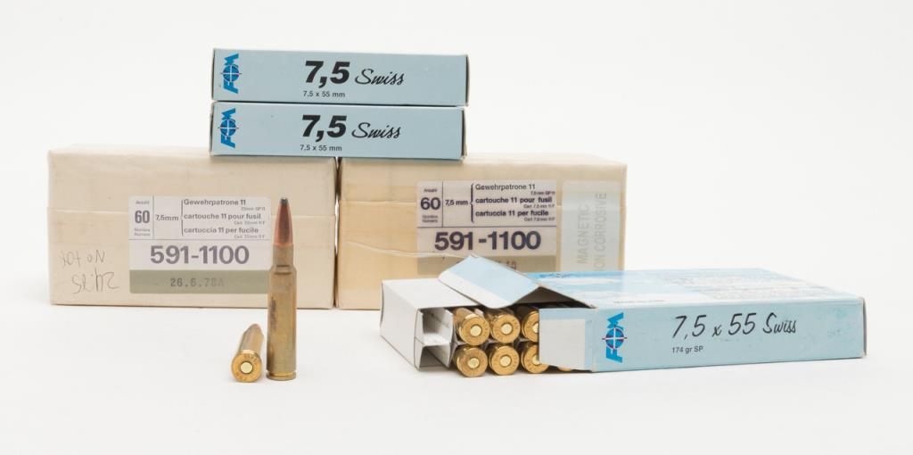 Lot of 180 rounds of 7.5 mm Swiss ammunition. 60 rounds of commercially manufactured ammo and two 60 rounds arsenal packs, for a total of 180 rounds. Est.: $90-$180.