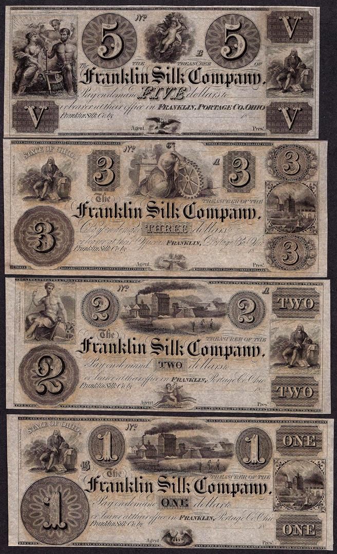 One Lot of 1800's $1/2/3/5 Franklin Silk Company Obsolete Notes.