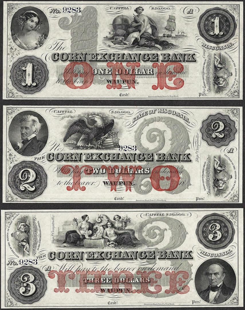 One Lot of 1800's $1/2/3 The Corn Exchange Bank Waupun, WI Obsolete Notes.