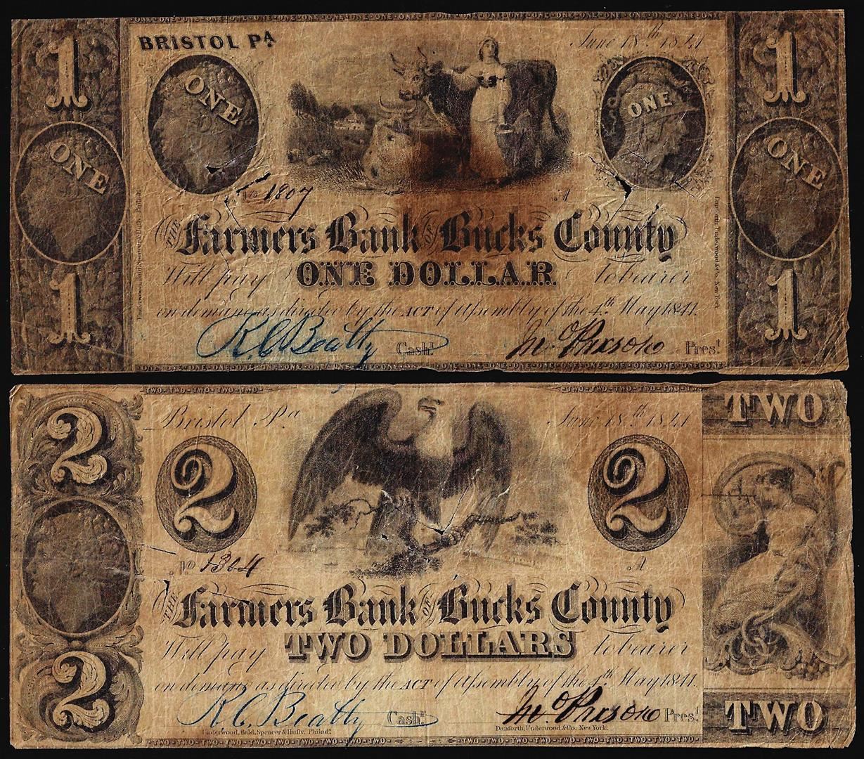 Lot of 1841 $1 & $2 Farmers Bank of Bucks County Bristol, PA Obsolete Bank Notes