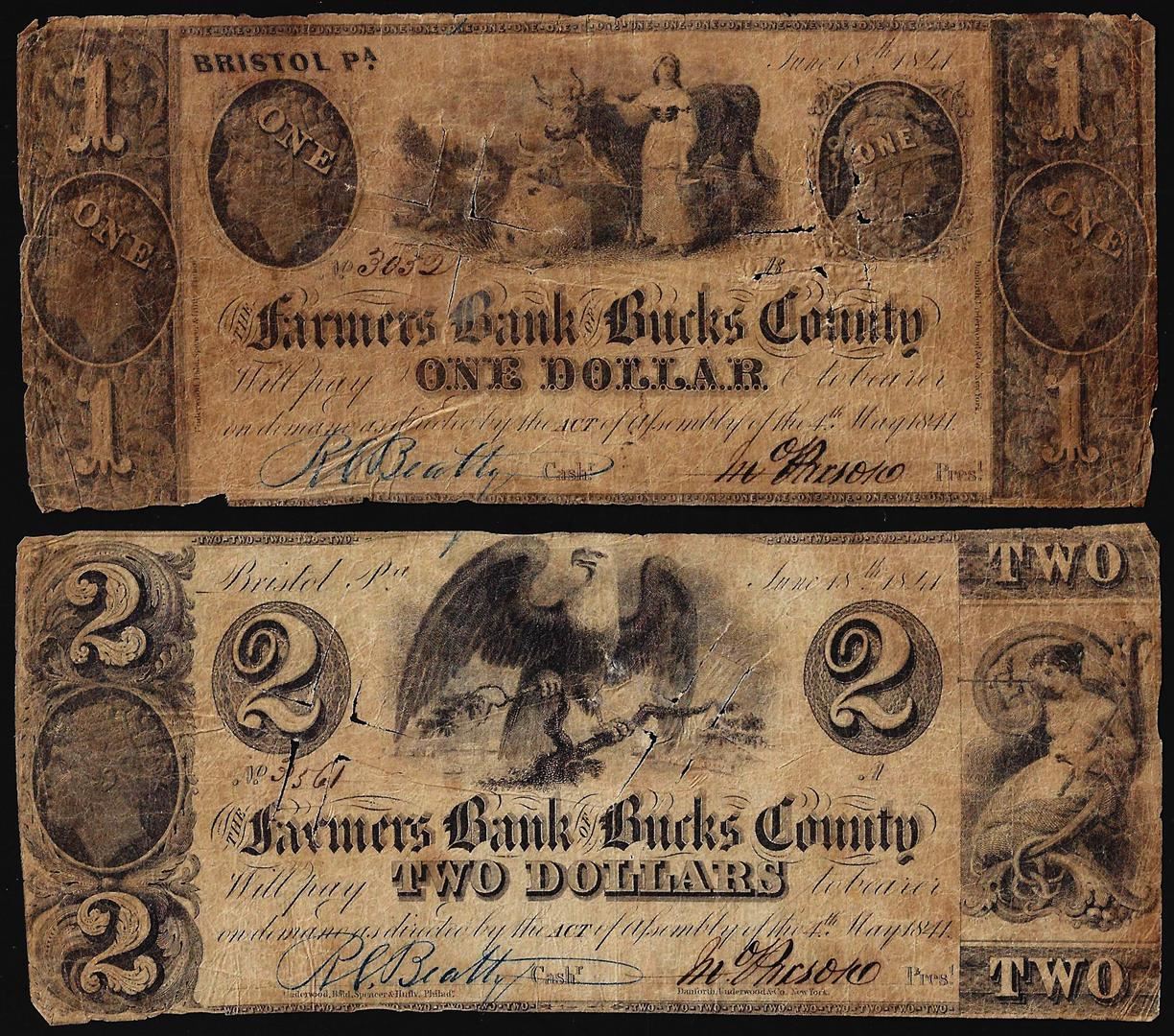 Lot of 1841 $1 & $2 Farmers Bank of Bucks County Bristol, PA Obsolete Bank Notes