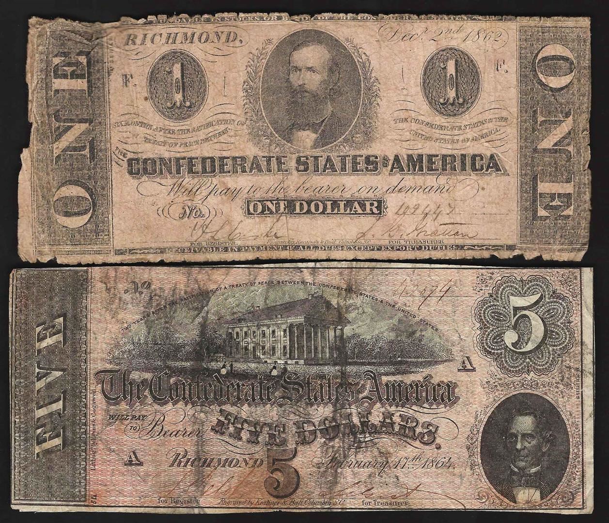 One Lot of 1862 $1 & 1864 $5 Confederate States of America Notes.