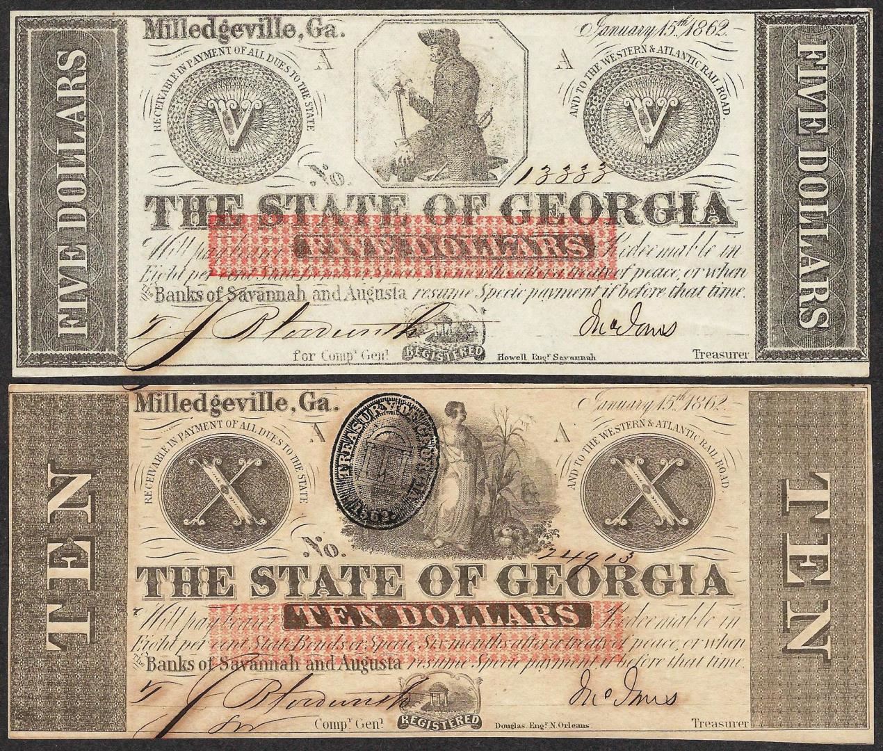 One Lot of 1862 $5 & $10 The State of Georgia Obsolete Notes.
