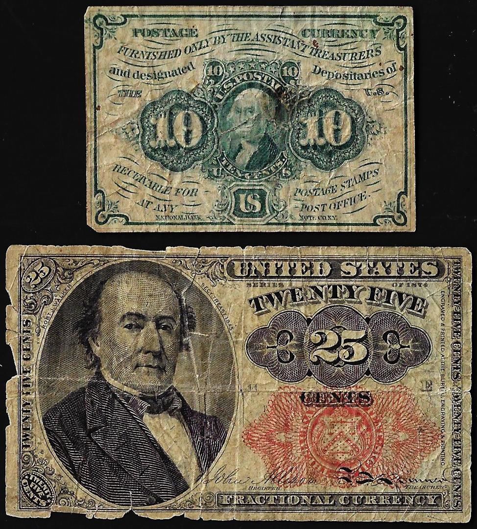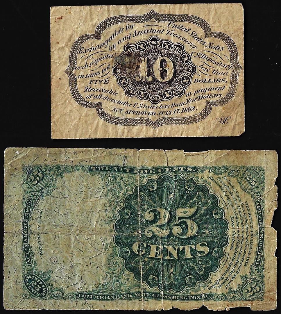 Lot of 1862 First Issue 10 Cent & 1874 Fifth Issue 25 Cent Fractional Currency Notes