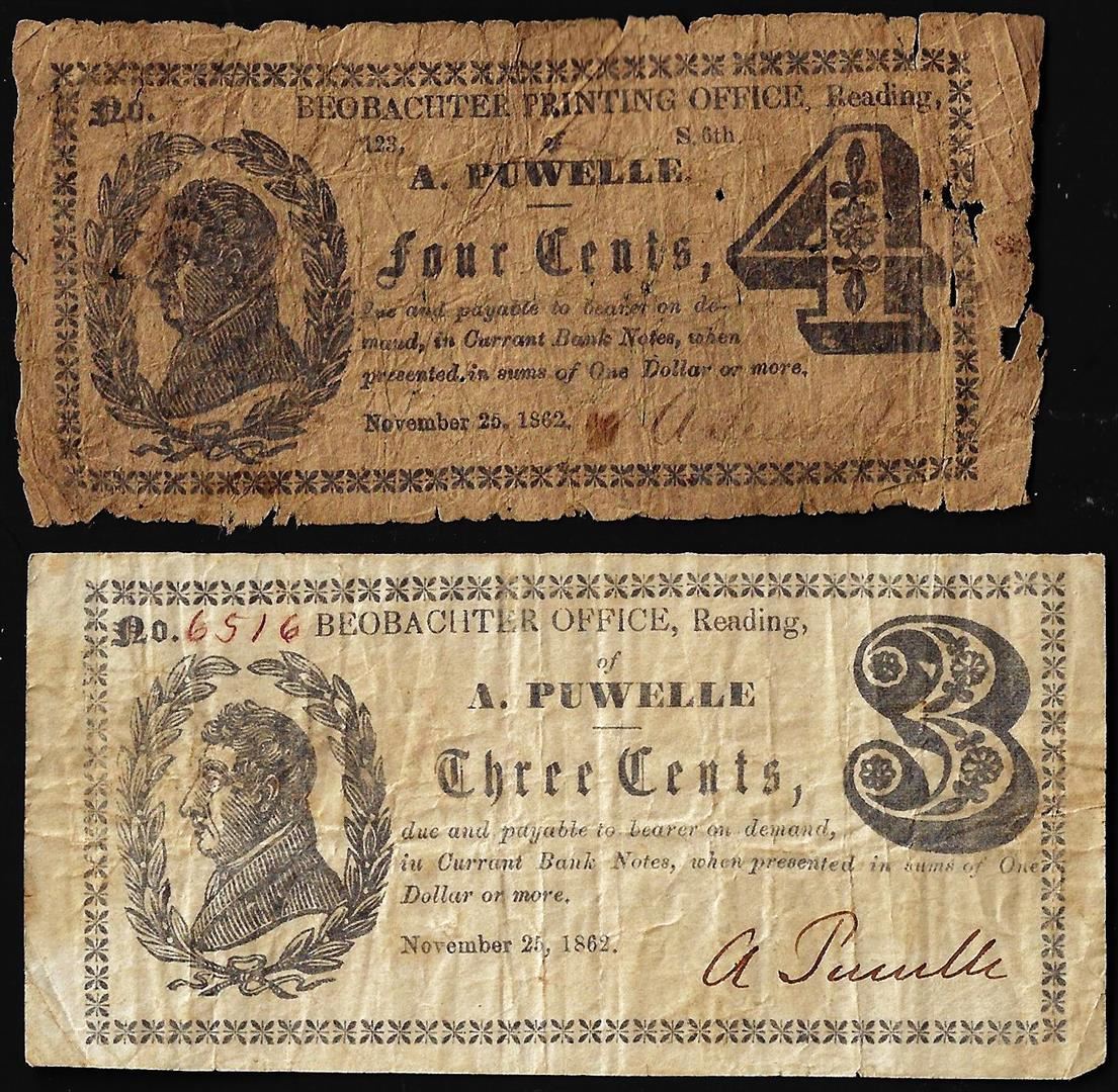 Lot of 1862 Puwelle Three and Four Cents Reading, PA Obsolete Scrip Notes