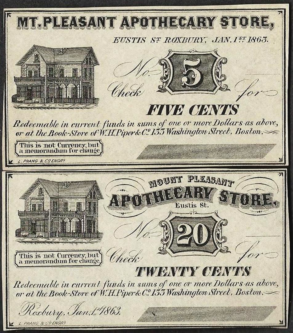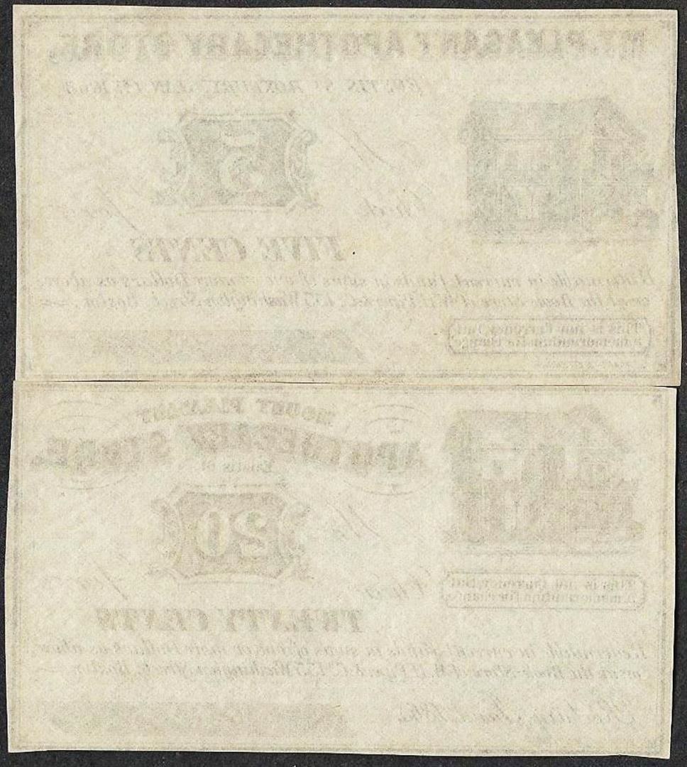 Lot of 1863 Five & Twenty Cents Mount Pleasant, MA Apothecary Store Obsolete Bank Notes