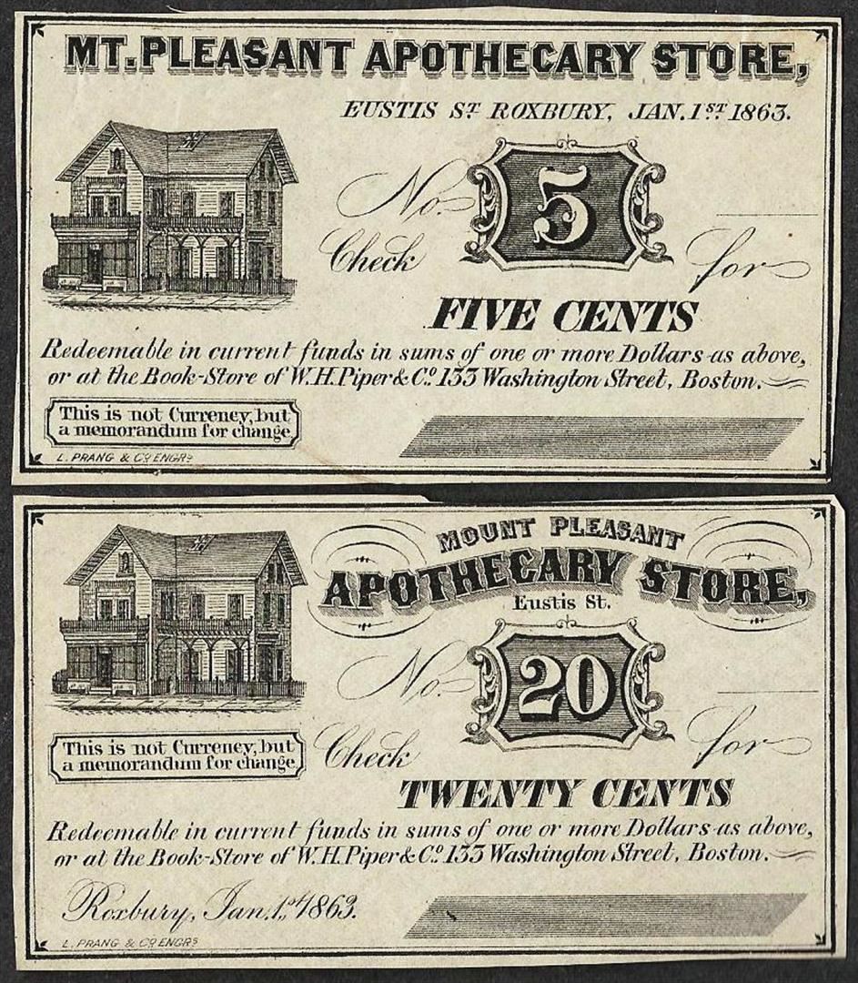 Lot of 1863 Five & Twenty Cents Mount Pleasant, MA Apothecary Store Obsolete Bank Notes