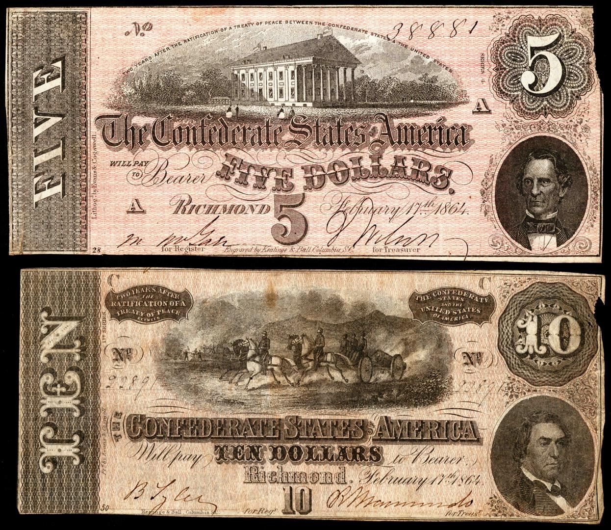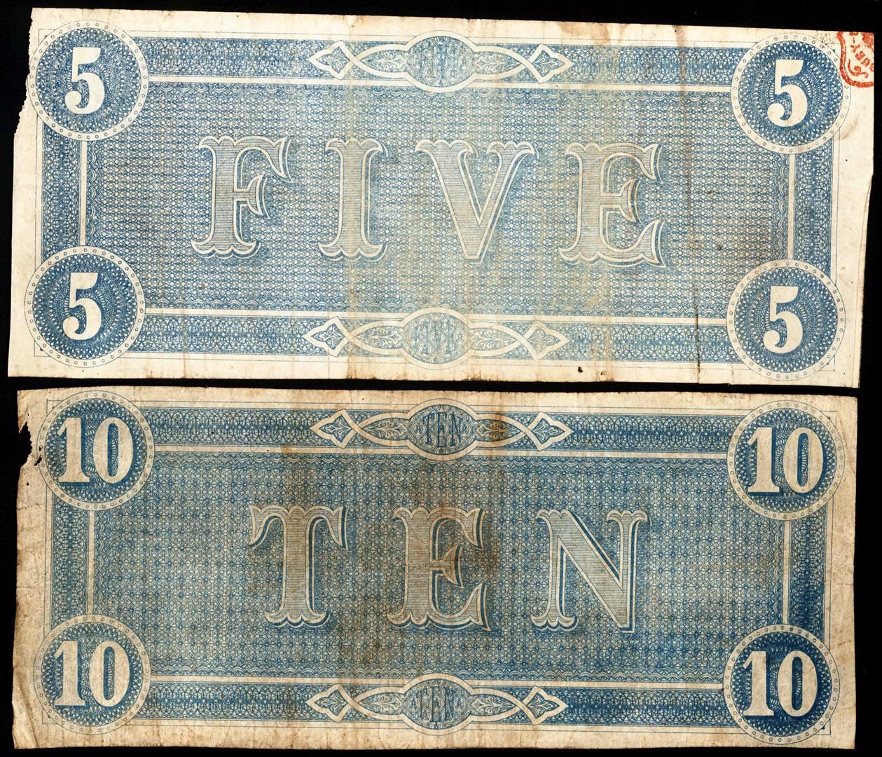 One Lot of 1864 $5 & $10 Confederate States of America Notes.