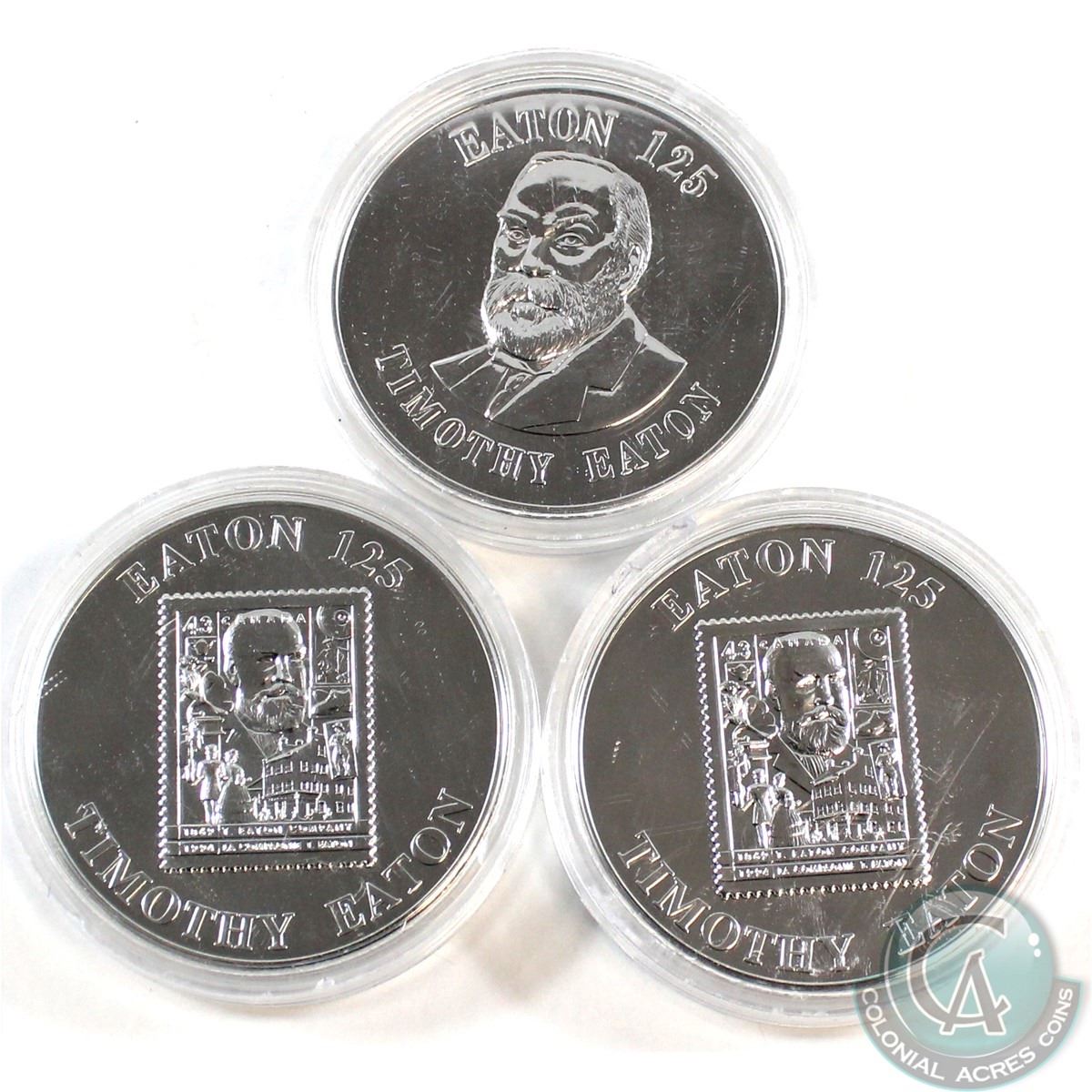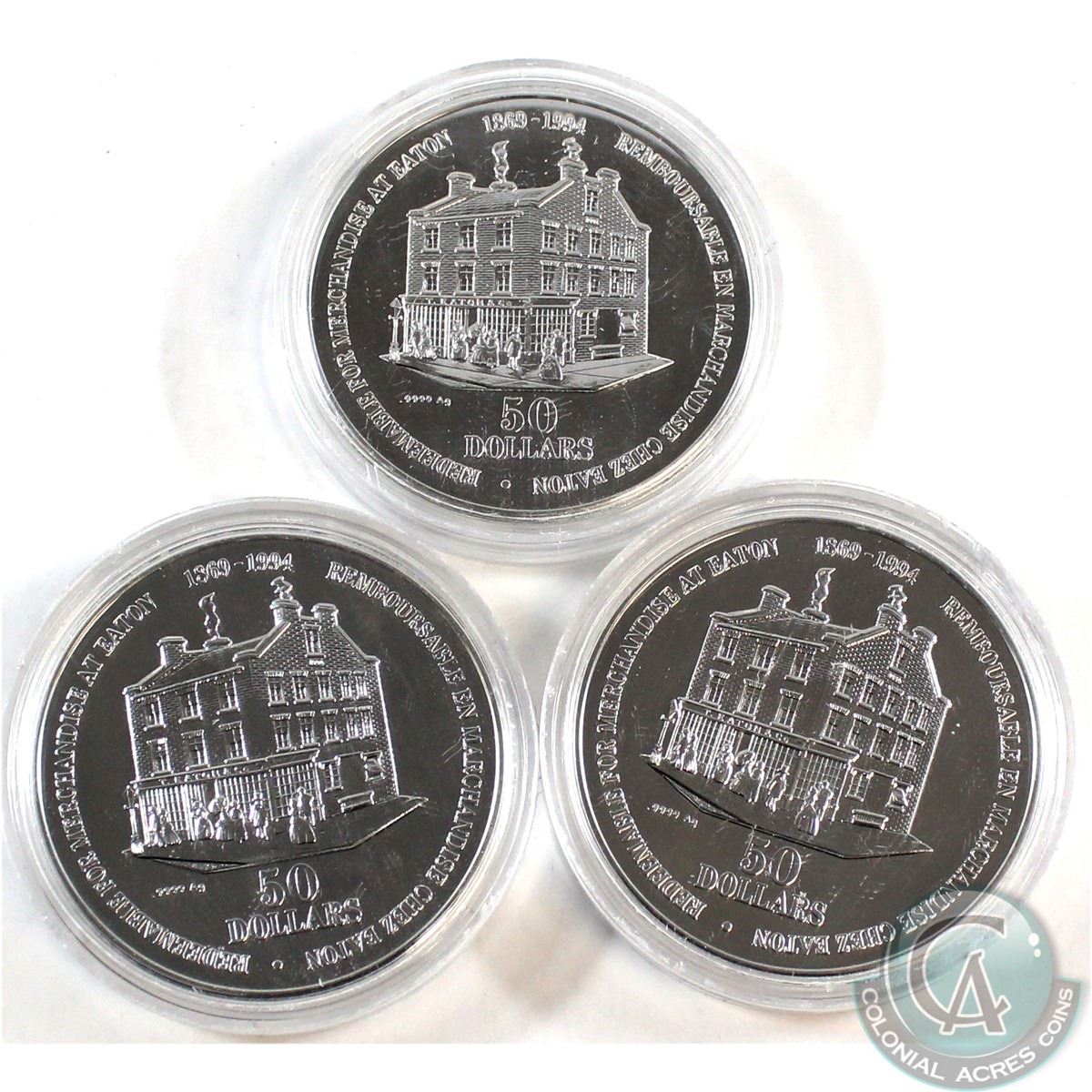Lot of 1869-1994 $50 Eaton 125 Timothy Eaton 1oz .999 Fine Silver Coins in Capsules (capsules are scratched). 3pcs (TAX Exempt)