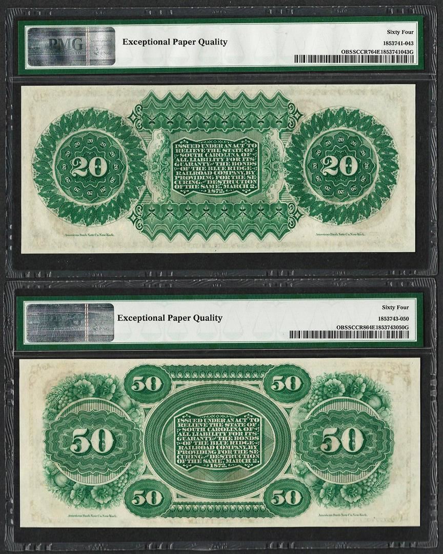 One Lot of 1872 $20 & $50 South Carolina Revenue Bond Obsolete Notes PMG Choice Unc. 64EPQ. PMG Certified.