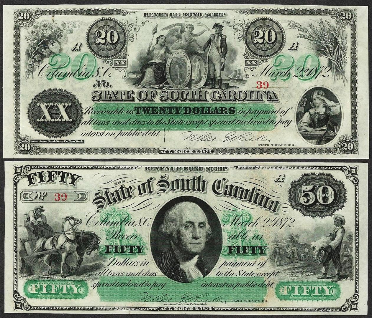 Lot of 1872 $20 & $50 State of South Carolina Revenue Bond Obsolete Notes