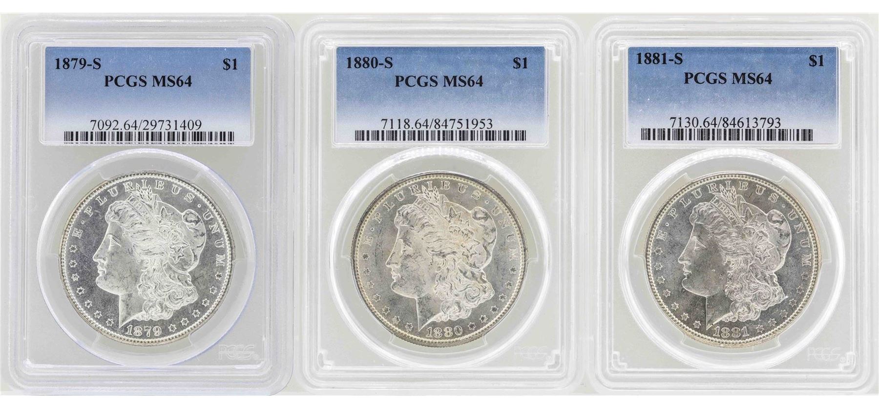 One Lot of 1879-S to 1881-S $1 Morgan Silver Dollar Coins PCGS MS64. PCGS Graded.