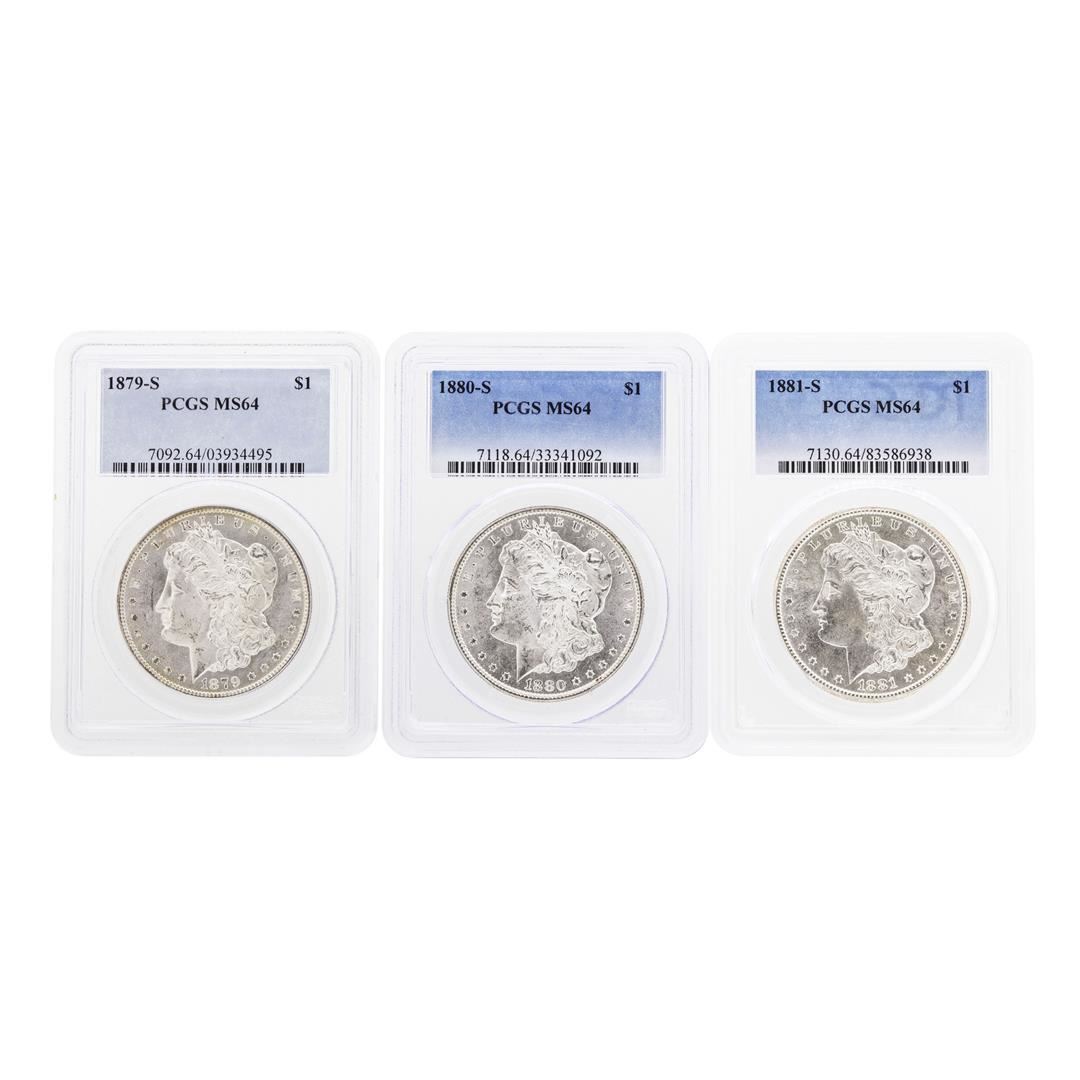 One Lot of 1879-S to 1881-S $1 Morgan Silver Dollar Coins PCGS MS64. PCGS Graded.