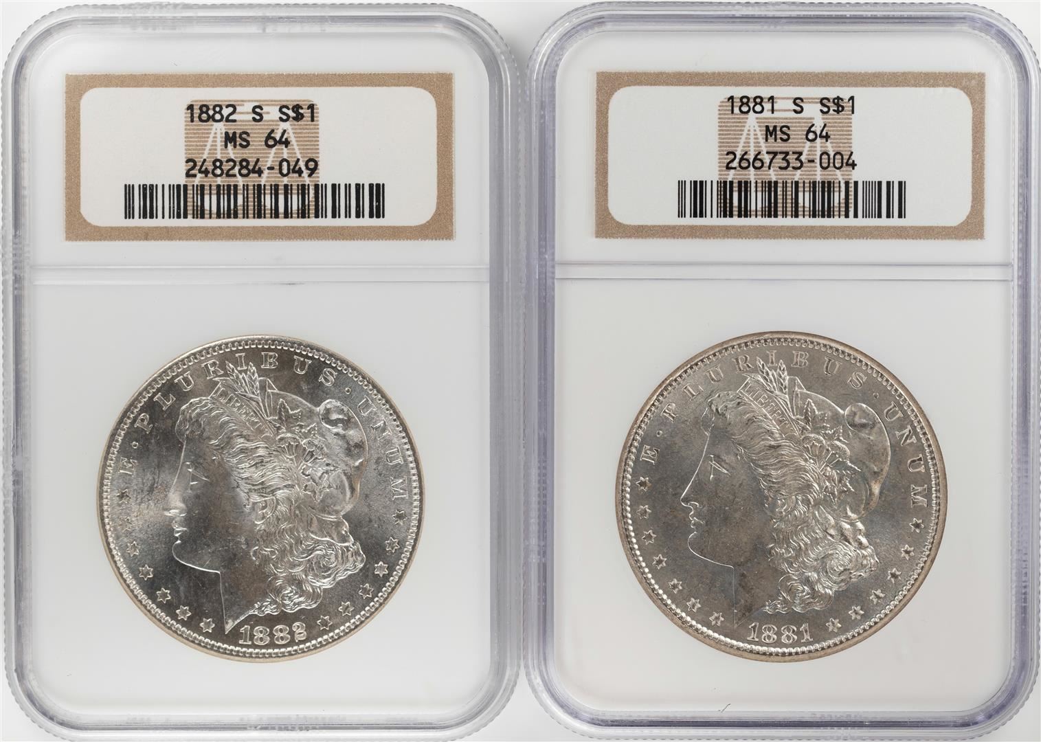 One Lot of 1881-S & 1882-S $1 Morgan Silver Dollar Coins NGC MS64. NGC Certified.