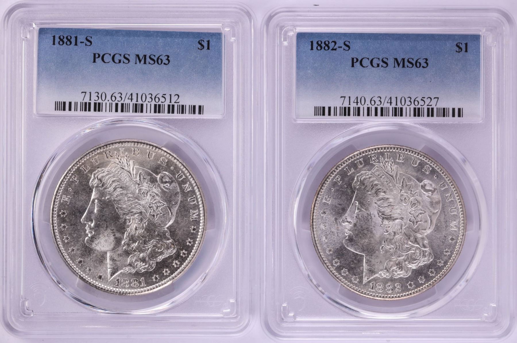 One Lot of 1881-S & 1882-S $1 Morgan Silver Dollar Coins PCGS MS63.