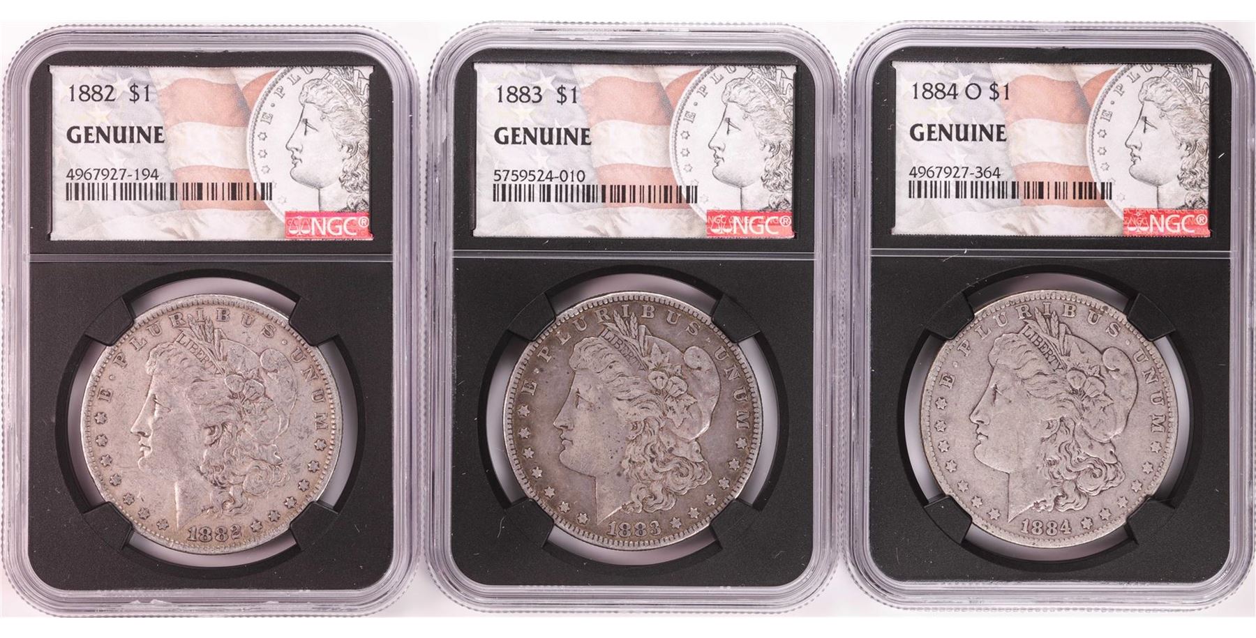 One Lot of 1882, 1883, & 1884-O $1 Morgan Silver Dollar Coins NGC Genuine. NGC Certified.