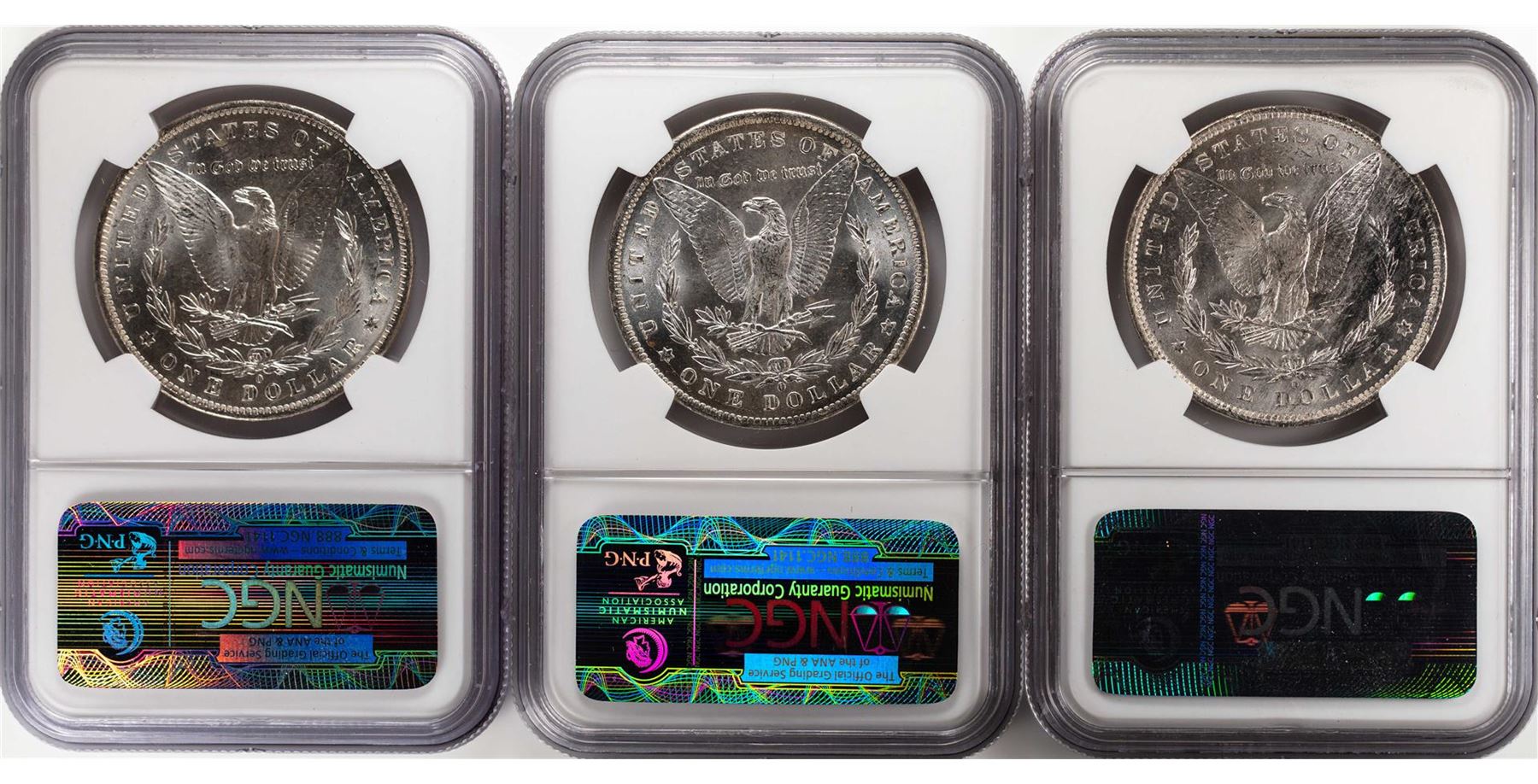 One Lot of 1883-O to 1885-O $1 Morgan Silver Dollar Coins NGC Brilliant Uncirculated. NGC Certified.