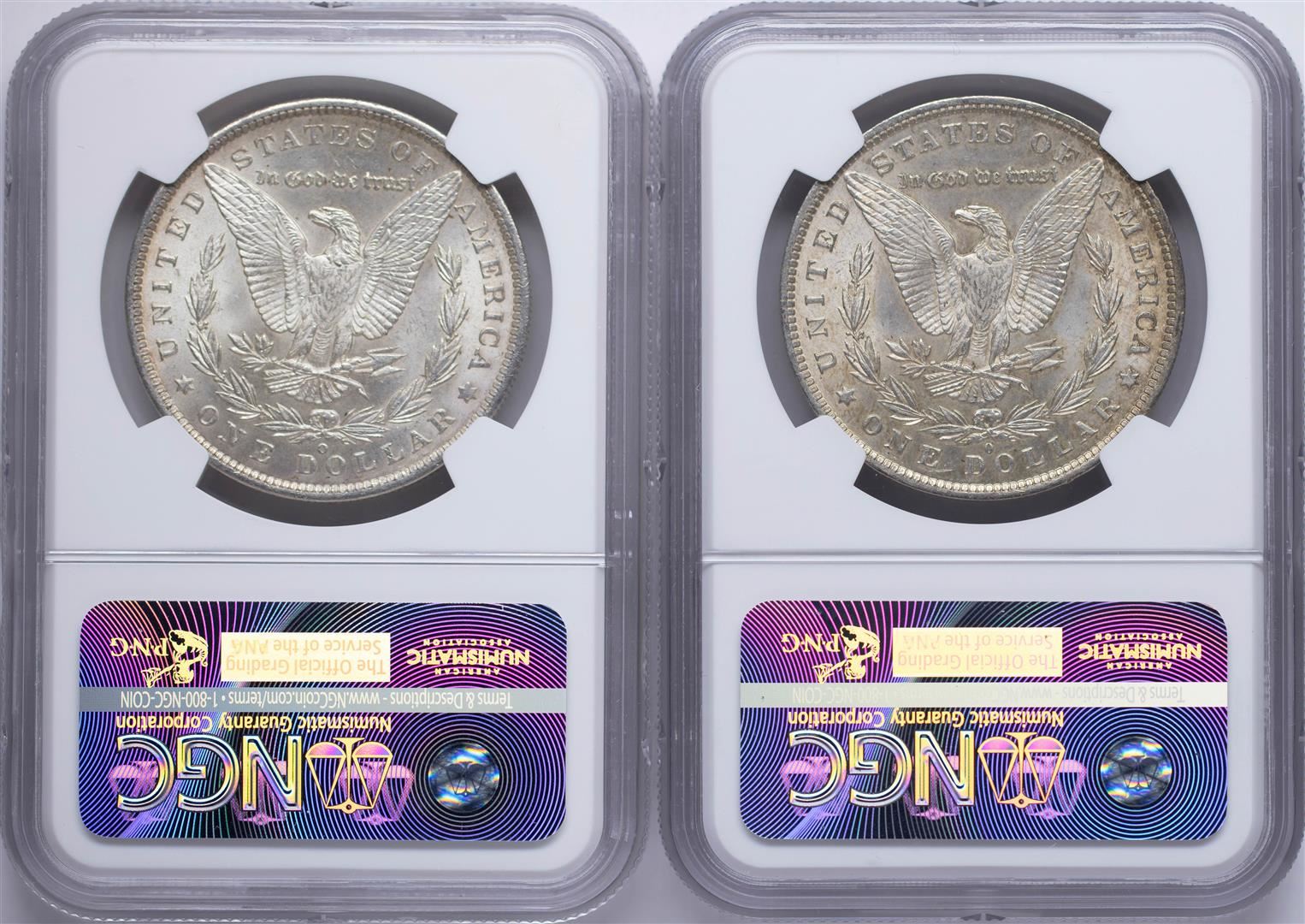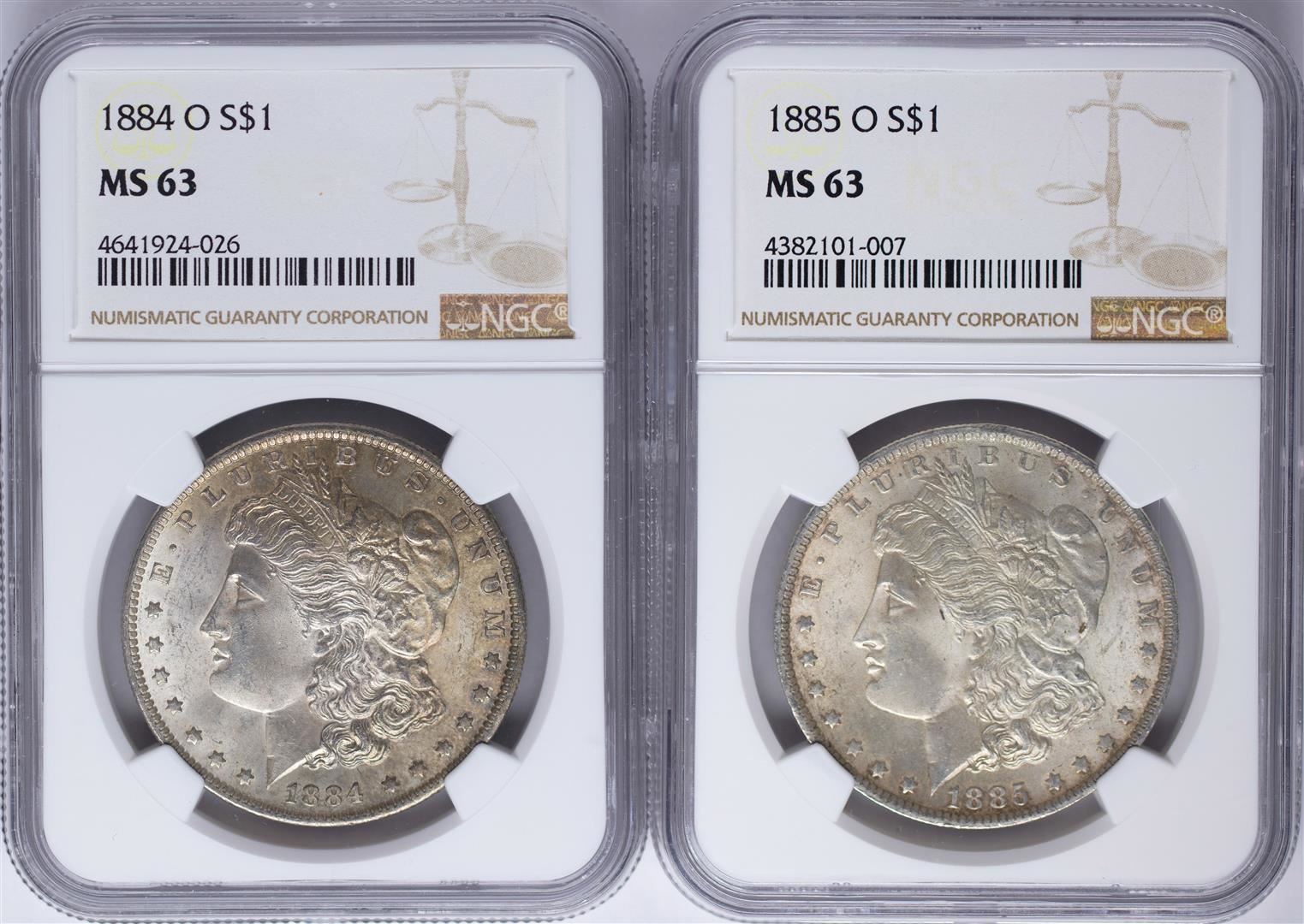 One Lot of 1884-O & 1885-O $1 Morgan Silver Dollar Coins NGC MS63. NGC Certified.
