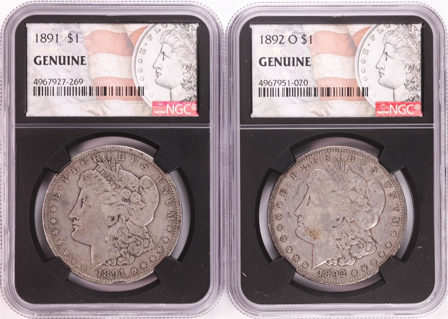 One Lot of 1891 & 1892-O $1 Morgan Silver Dollar Coins NGC Genuine. NGC Certified.