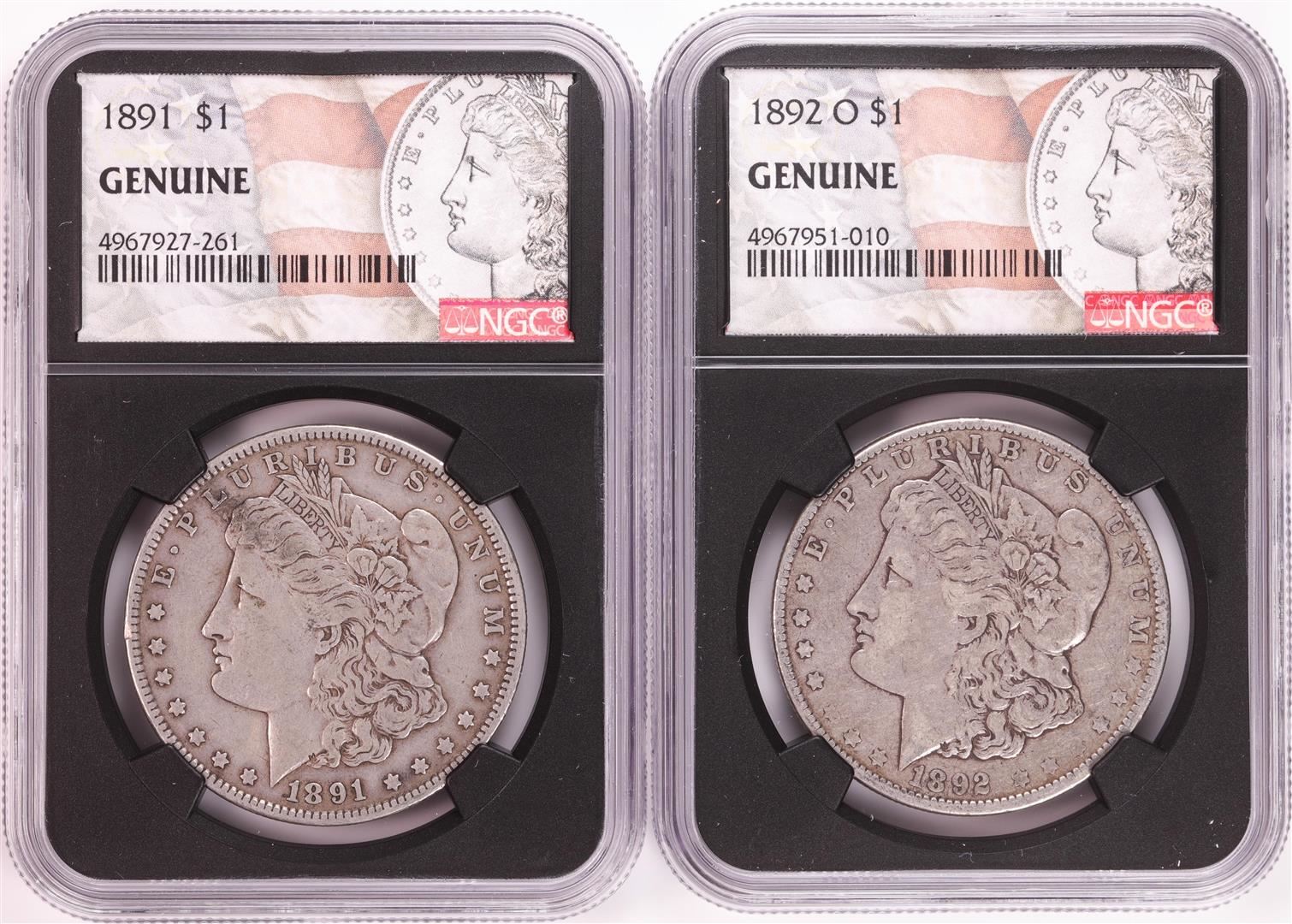 One Lot of 1891 & 1892-O $1 Morgan Silver Dollar Coins NGC Genuine. NGC Certified.
