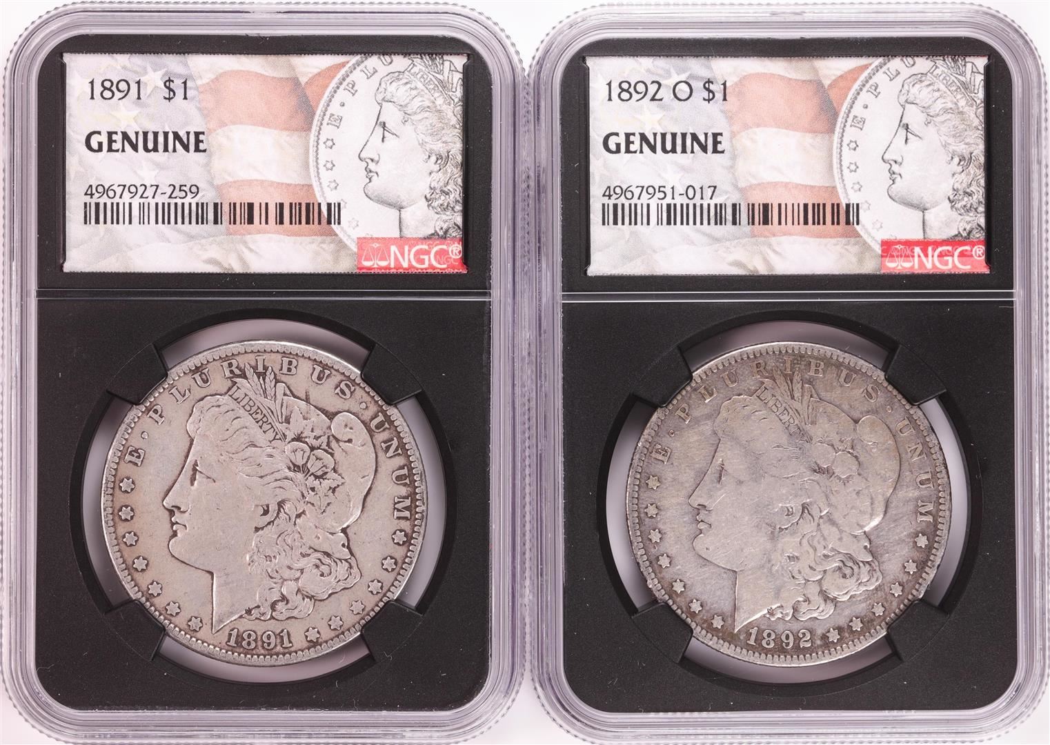 One Lot of 1891 & 1892-O $1 Morgan Silver Dollar Coins NGC Genuine. NGC Certified.