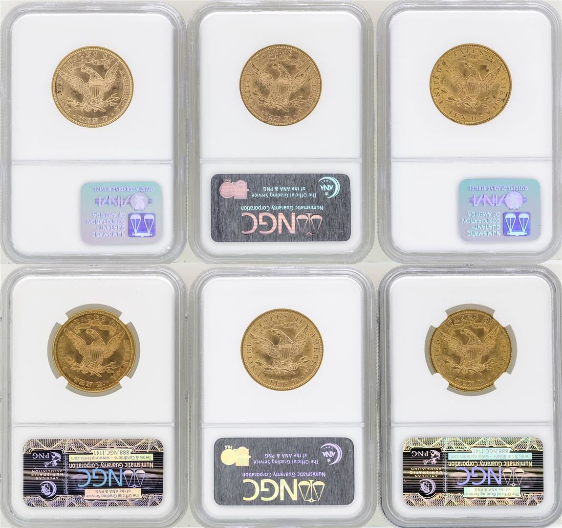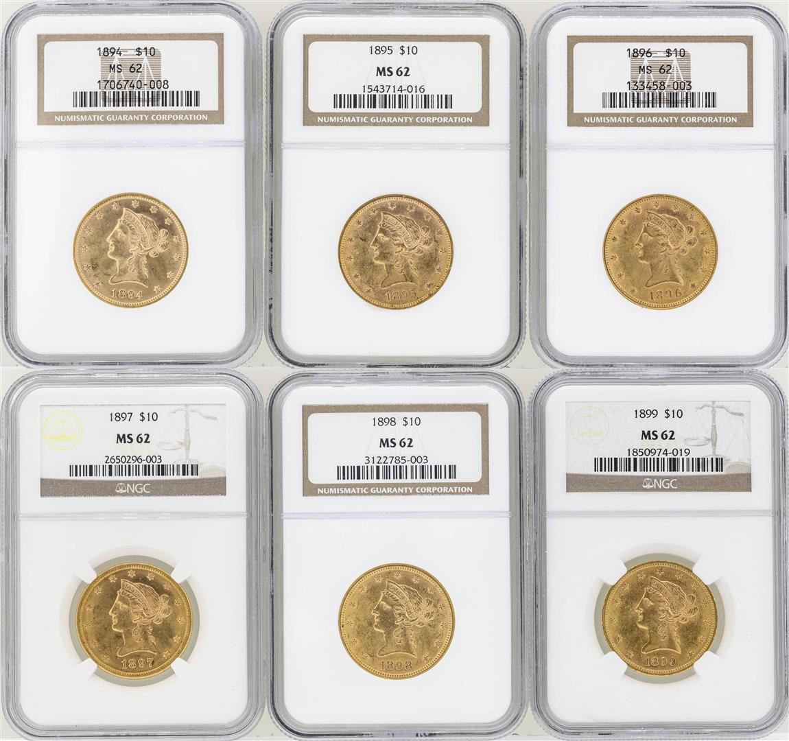 One Lot of 1894-1899 $10 Liberty Head Eagle Gold Coins NGC MS62. NGC Certified.