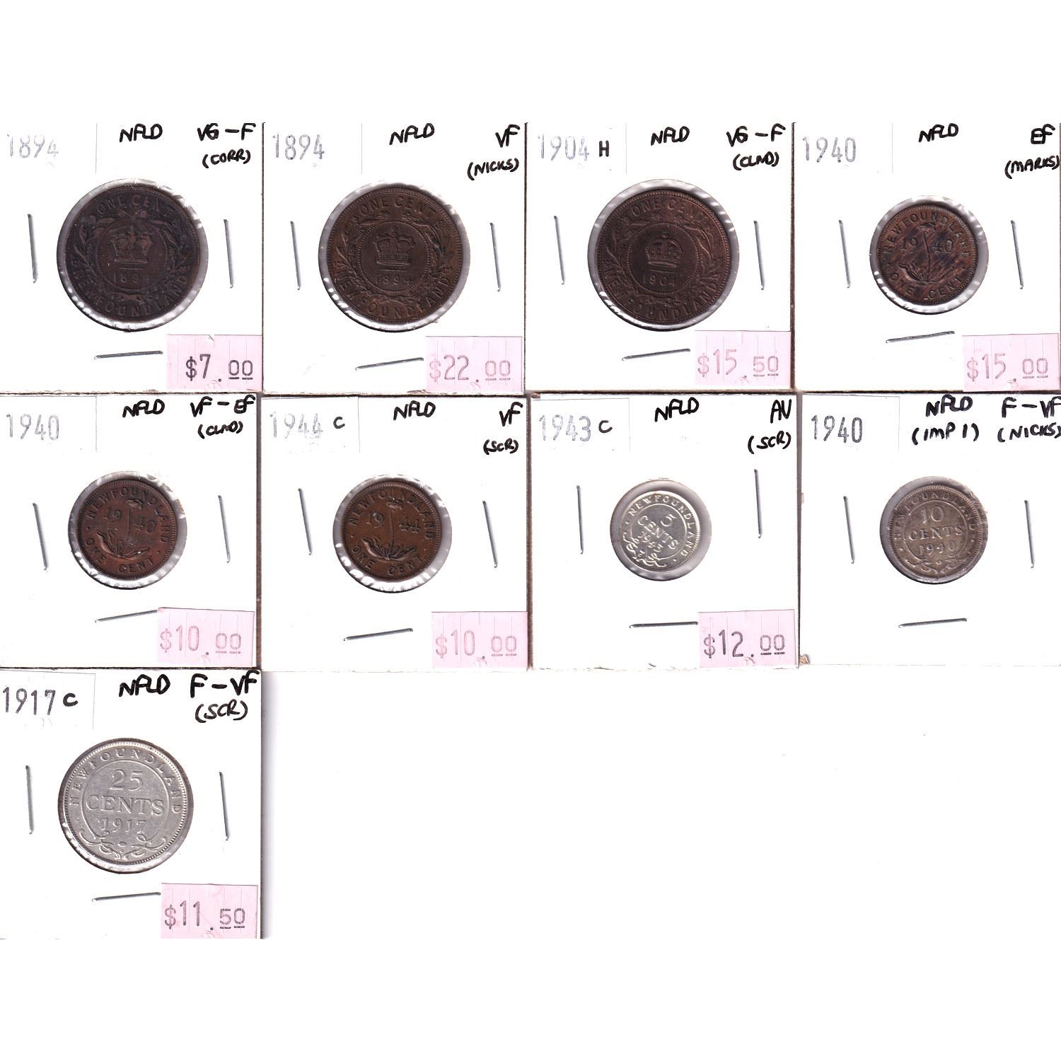 Lot of 1894-1944 Newfoundland Coinage (scratches, cleaned or impaired) 9pcs.