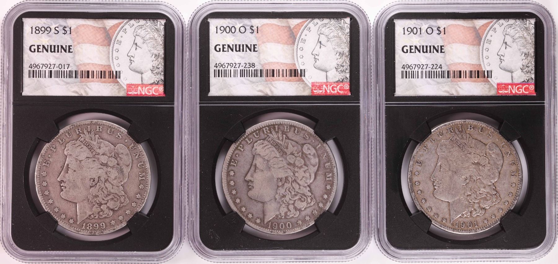Lot of 1899-S, 1900-O, & 1901-O $1 Morgan Silver Dollar Coins NGC Genuine