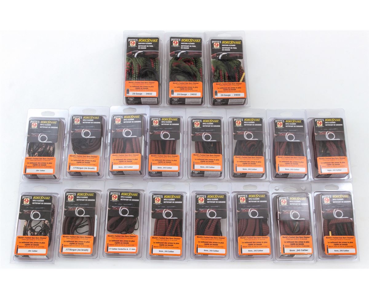 Lot of Nineteen (19) Hoppe's BoreSnake Rifle and Shotgun Cleaners, for 6mm/.243 cal.; .177 airgun; .17 cal CF & .17 HMR; and 28 ga. All brand new in original packaging. Retails @ over $375/lot. Est.: $200-$250/lot. (Field Time)
