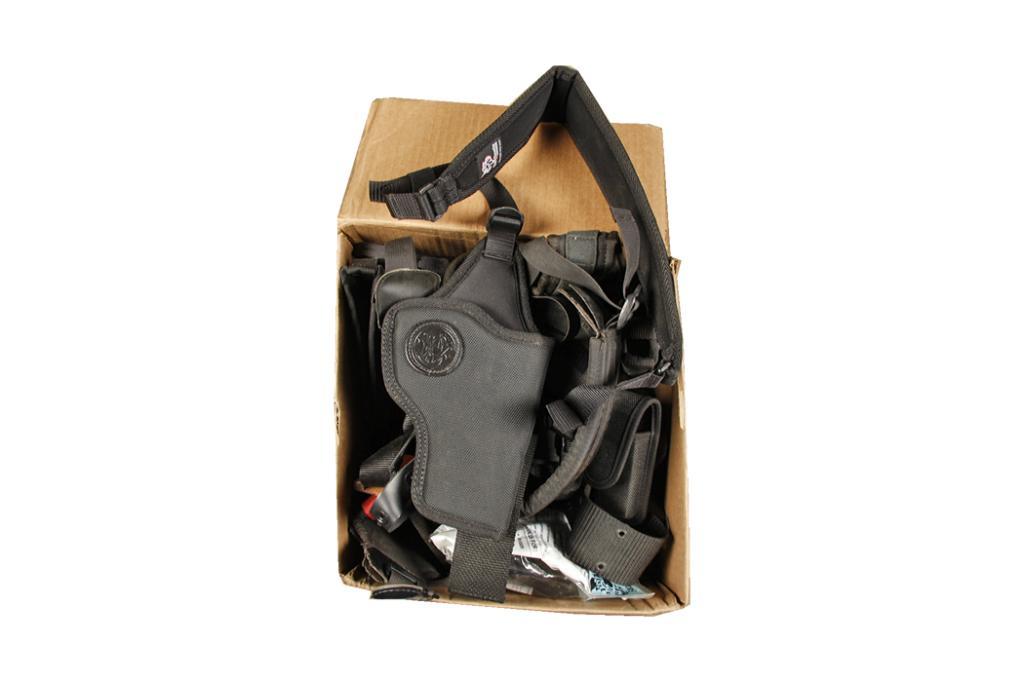 Lot of 19 Nylon/Canvas Holsters and Belts Lot includes holsters from famous makers such as Bianchi, S&W, Uncle Mike's, and Safari Land. Some have belts or shoulder harnesses, magazine pouches, or cartridge belts. Some still in the package but most are usLot includes holsters from famous makers such as Bianchi, S&W, Uncle Mike's, and Safari Land. Some have belts or shoulder harnesses, magazine pouches, or cartridge belts. Some still in the package but most are used but show little or nowear. 19 holsters in all.