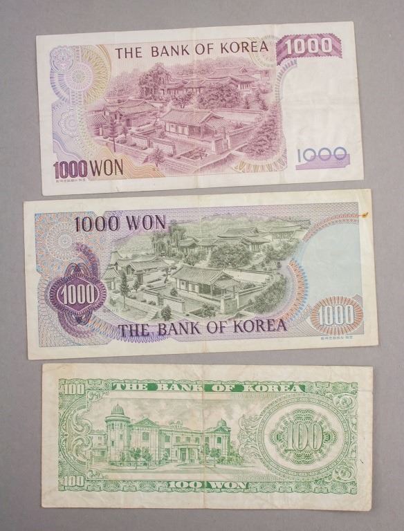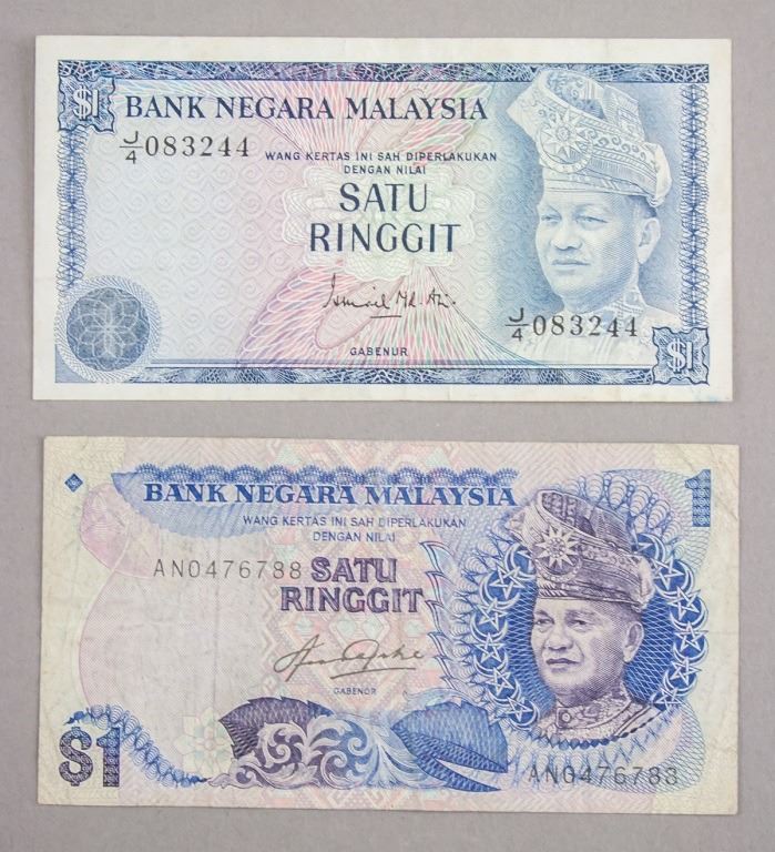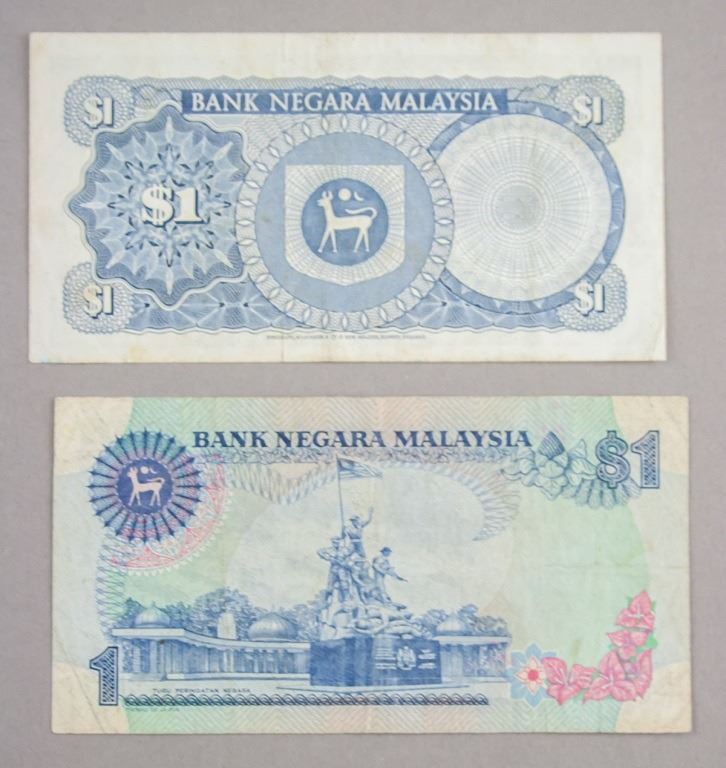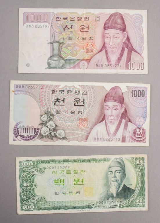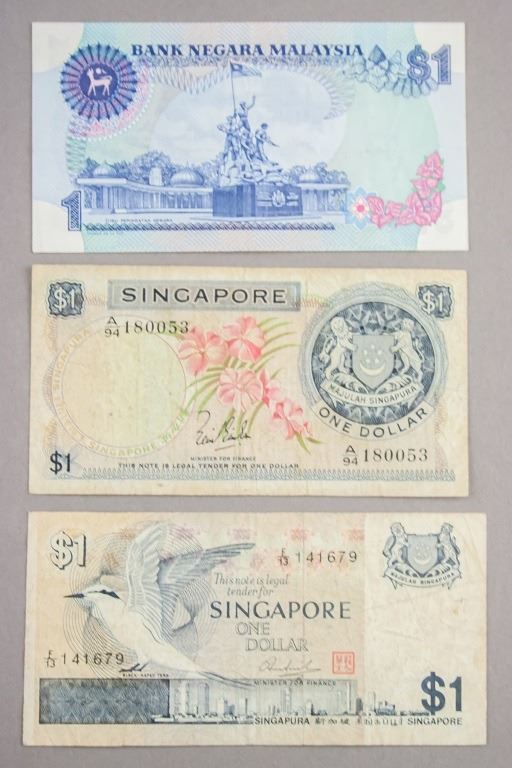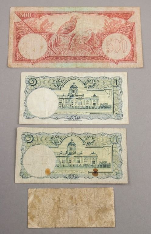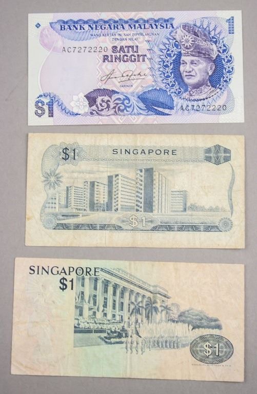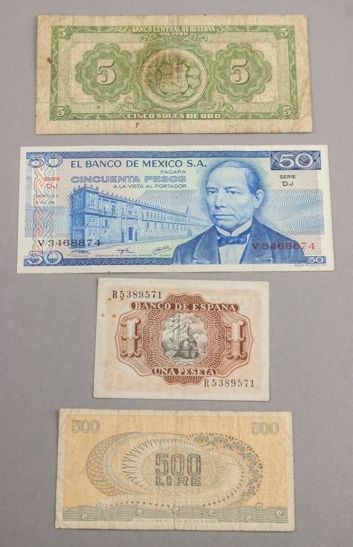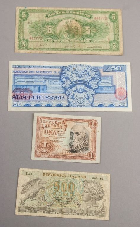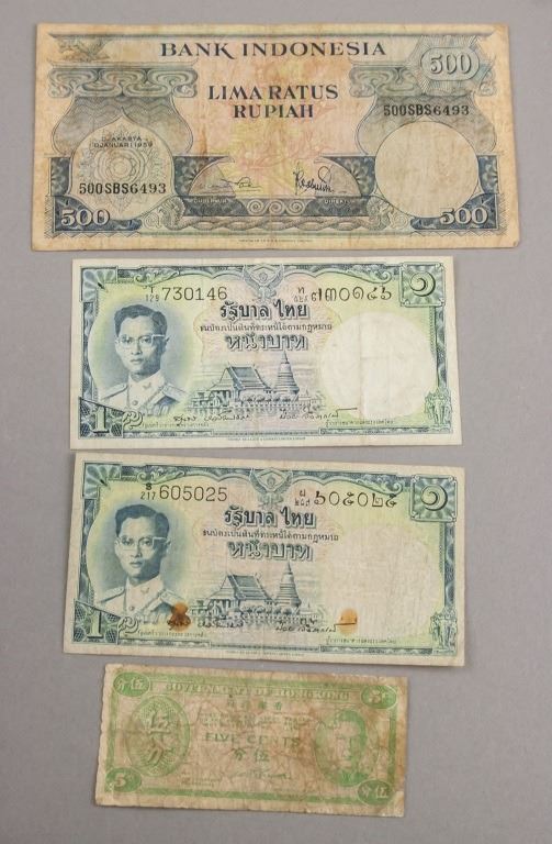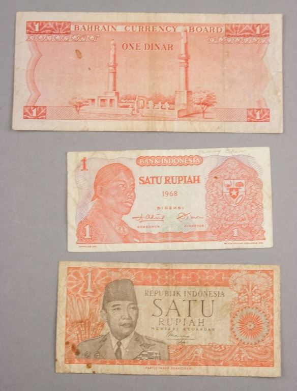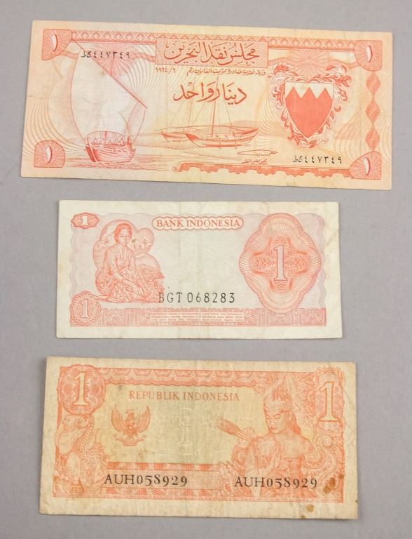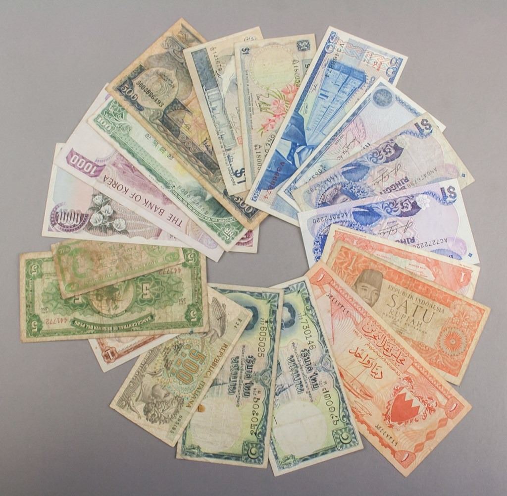 Lot of 19 paper monies. From Korea (1000 Won, 100 Won), Malaysia ($1), Singapore ($1), Bahrain (1 Dinar), Indonesia (1 Rupiah, 500 Rupiah), Peru (5 Soles de Oro), Mexico (50 Pesos), Spain (1 Peseta), Italy (500 Lire), Thailand (1 Baht), and Hong Kong (5 cents).