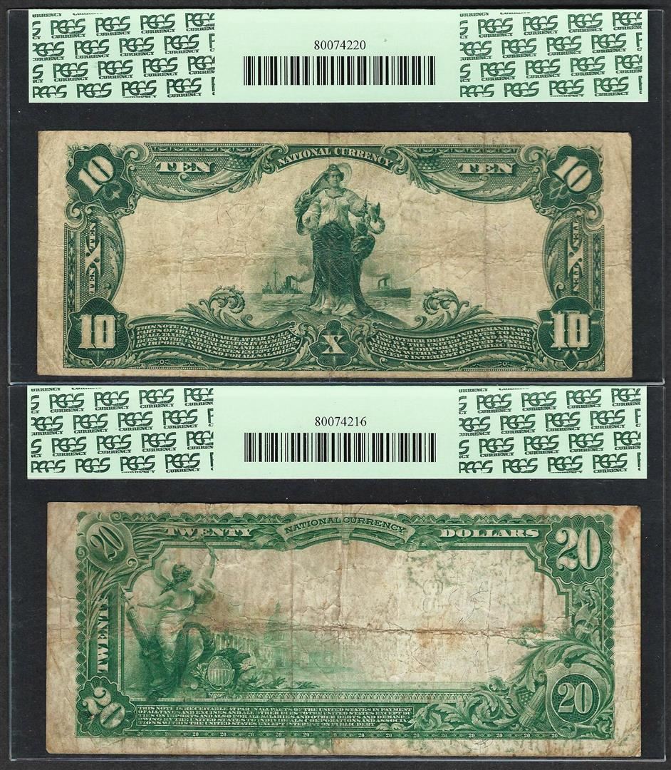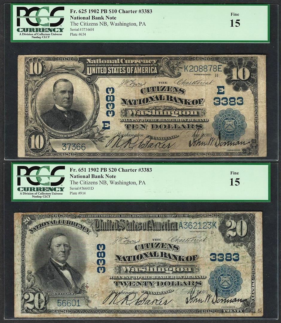 Lot of 1902PB $10/20 Washington, PA CH# 3383 National Currency Notes PCGS Fine 15