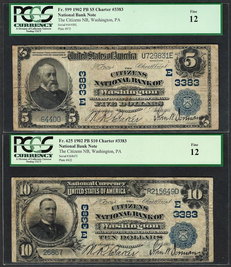 One Lot of 1902PB $5/10 Washington, PA CH# 3383 National Currency Notes PCGS Fine 12. PCGS Graded.