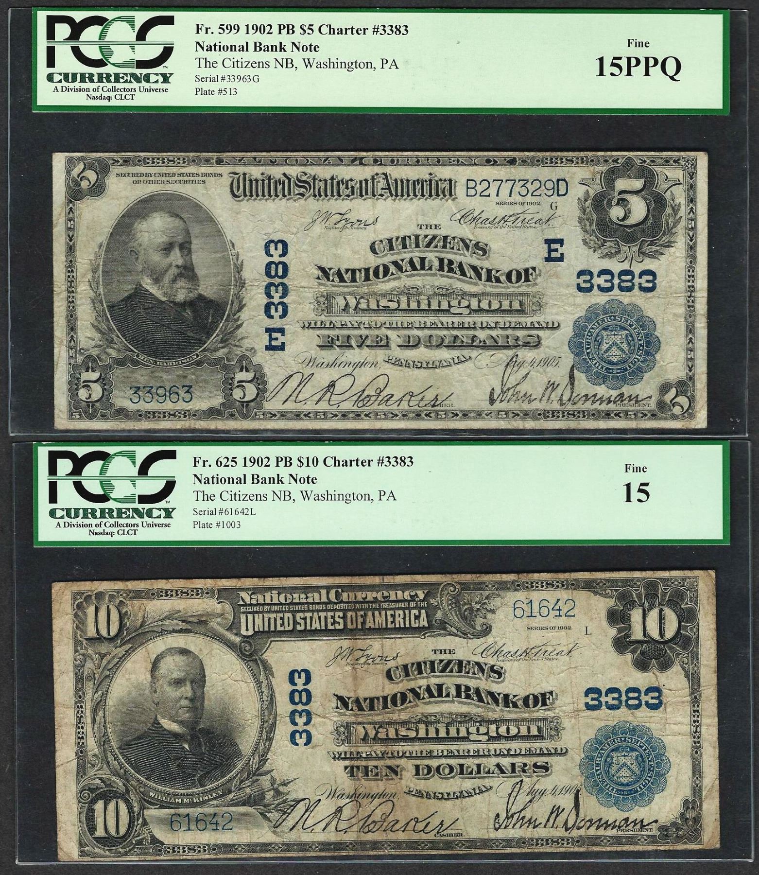 One Lot of 1902PB $5/10 Washington, PA CH# 3383 National Currency Notes PCGS Fine 15/PPQ.