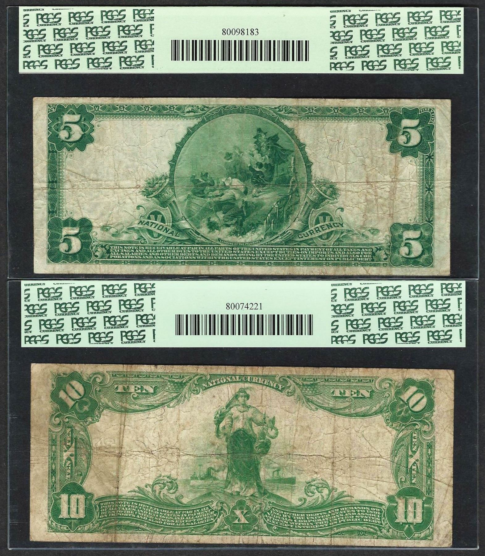 One Lot of 1902PB $5/10 Washington, PA CH# 3383 National Currency Notes PCGS Fine 15/PPQ.