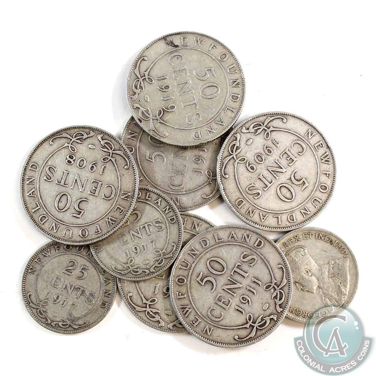 Lot of 1908-1938 Newfoundland 10-cent, 25-cent & 50-cent. You will receive 6x 50-cent, 3x 25-cent & 1x 10-cent. 10pcs