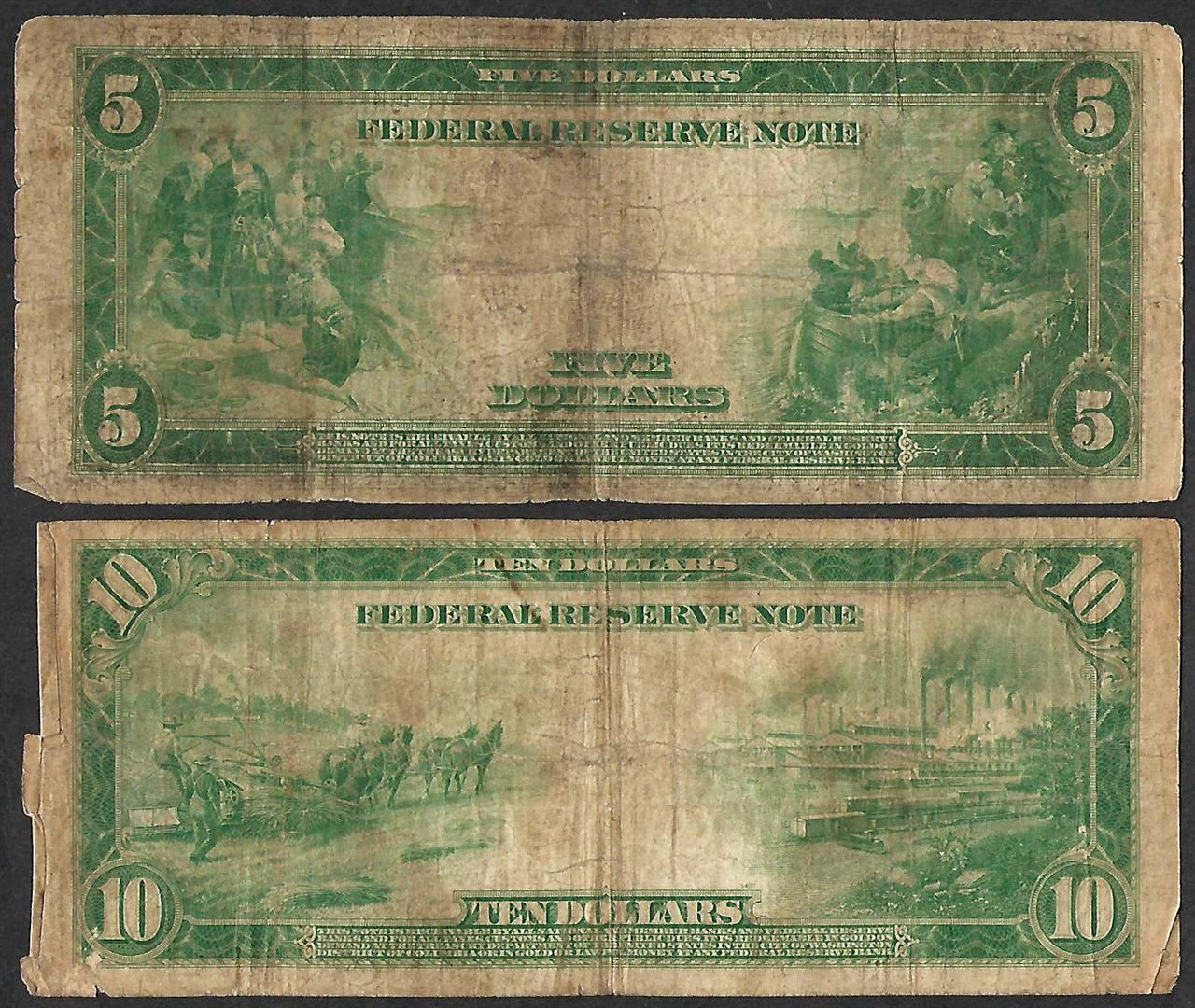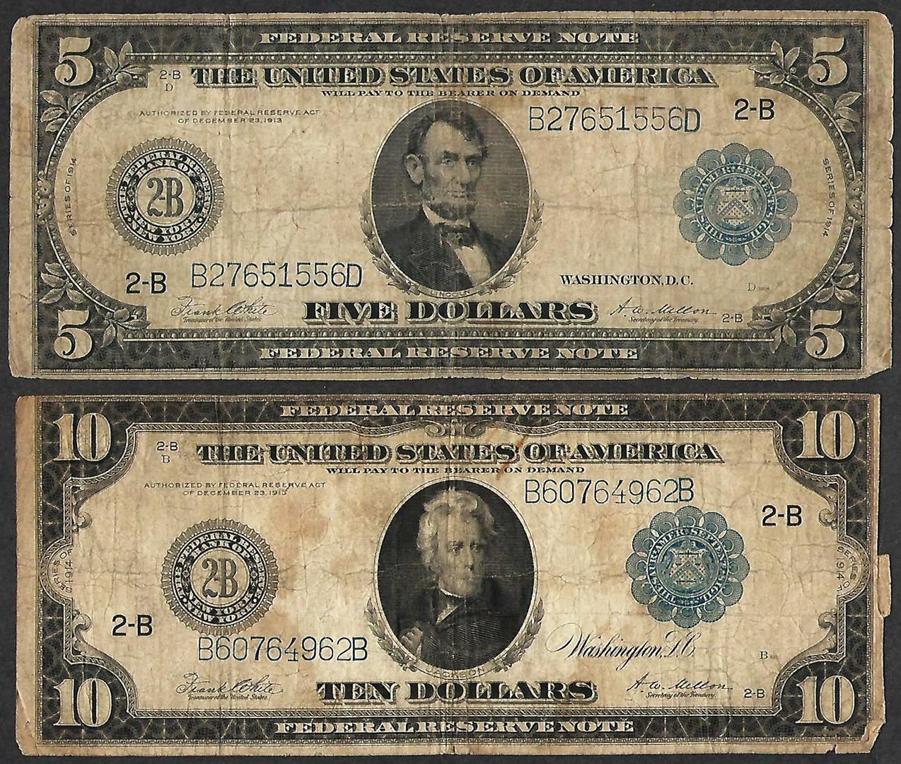 One Lot of 1914 $5/$10 Federal Reserve Notes New York.