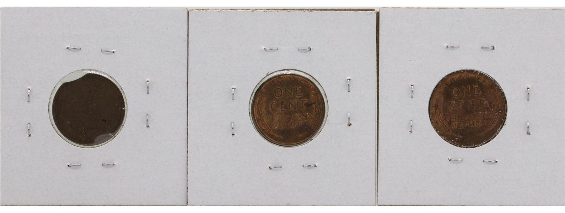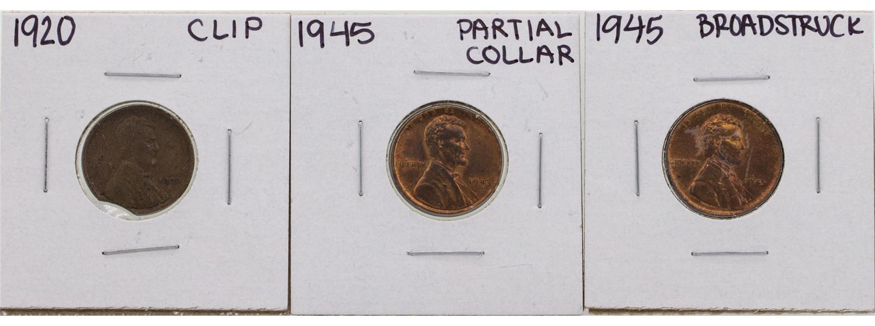 Lot of 1920 Clip, 1945 Partial Collar & 1945 Broadstruck Lincoln Pennies ERROR C